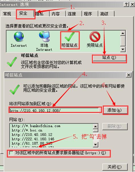 登录报名系统后,单击浏览器的“工具”“Internet 选项”,弹出对话框。将http://210.40.160.12:808添加到可信站点。根据图上的顺序进行操作。