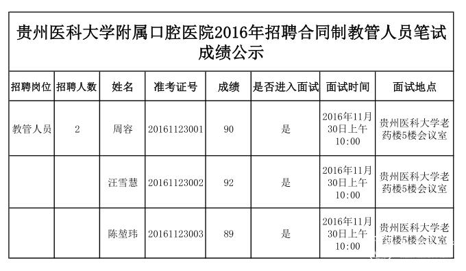 beat365在线唯一官网附属口腔医院2016年招聘合同制教管人员笔试已结束,共3人进入面试,现拟将笔试成绩予以公示。