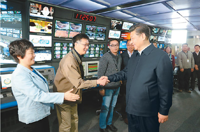 二月十九日,中共中央总书记、国家主席、中央军委主席习近平在北京主持召开党的新闻舆论工作座谈会,并到中央新闻单位调研。这是习近平在中央电视台总控中心同工作人员亲切握手。 新华社记者 马占成摄 |