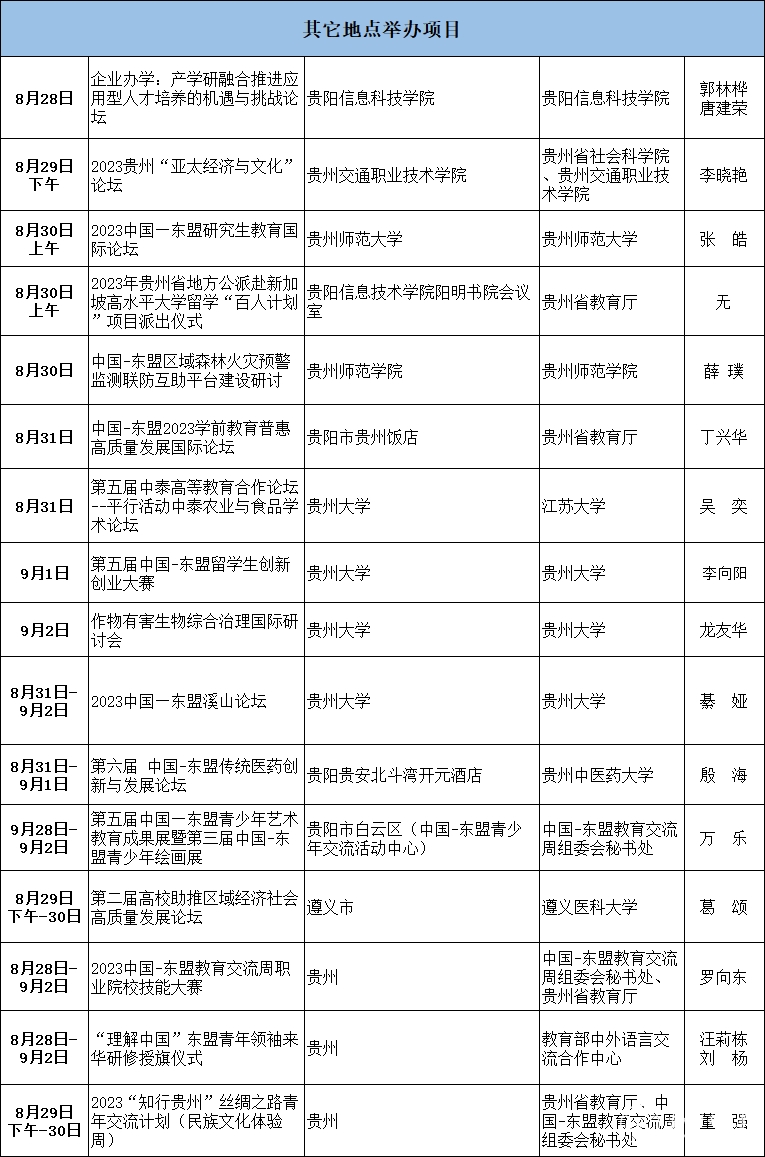 由外交部、教育部、贵州省人民政府共同主办的2023中国—东盟教育交流周将于8月28日-9月2日举办。本次交流周主题为“教育合作新愿景·‘一带一路’共繁荣”,交流周将举办活动122项,其中,开幕期拟举办配套活动65项,全年其他时段举办活动57项。活动突出“形式新”、突出“项目化”“多元化”“合作化”。开幕活动将首次采用“开幕式+主论坛”方式举办。