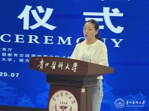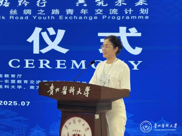 南方医科大学国际教育学院院长陈君作为协同主办方代表致辞。她指出,夏令营已成为中外青年文化交融的优质载体,希望青年学子以贵州为窗口,通过实地探访感知真实立体的中国,成为文化交流的青春使者。