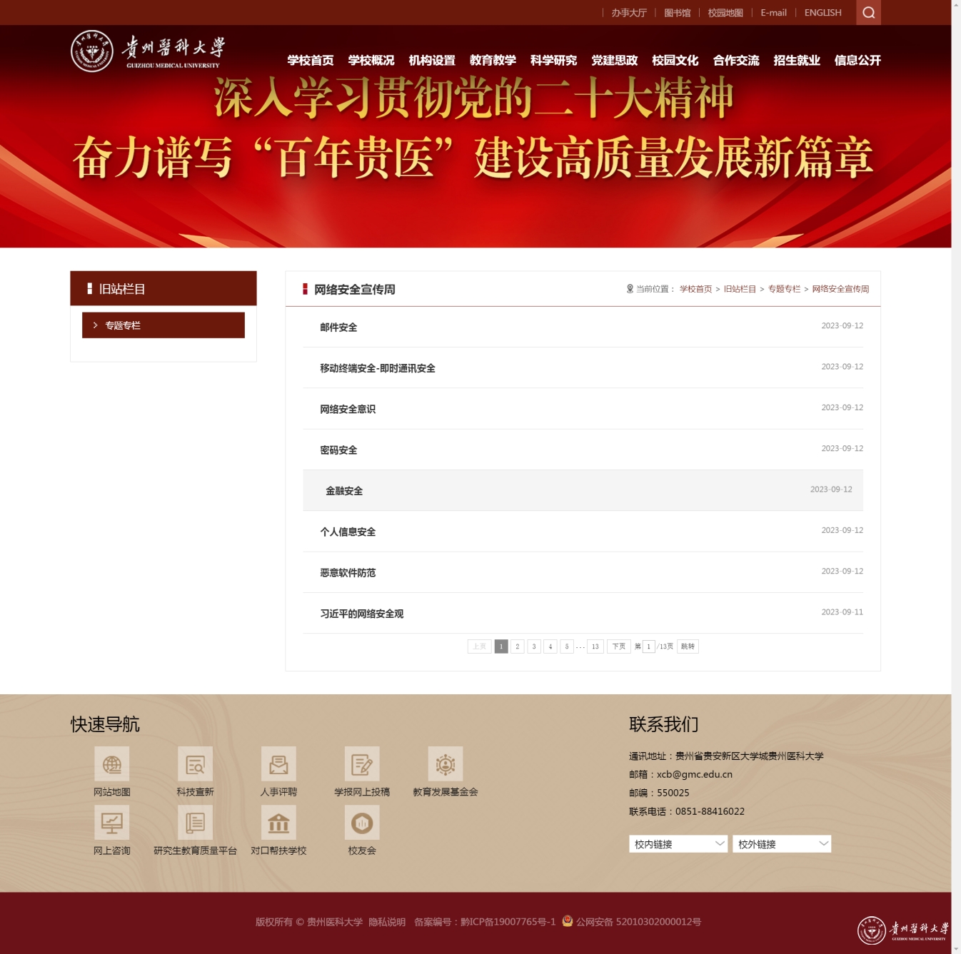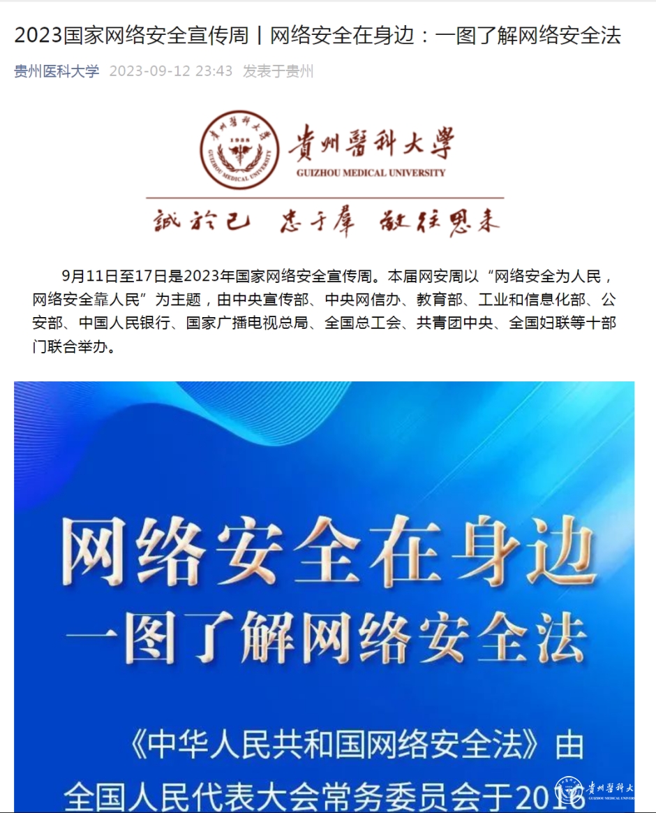 同时,党委学生工作部(学生处、武装部)向全校学生推送《国家网络安全宣传周来了,这些知识你get了吗?》专题APP,详细介绍网络安全法律法规体系、关键信息基础设施安全保护、新型电信网络诈骗手法揭秘等内容。党委宣传部(精神文明办)利用横幅、显示屏等载体营造网络宣传氛围,依托官网、官微推出国家网络安全周线上专题学习板块,围绕“习近平的网络安全观”“网络安全意识”“个人信息安全”等方面,面向全校教职医护员工不同需求进行宣传介绍,满足各层级网民对网络安全知识学习的需求,提升大家网络安全意识和防护技能,动员全校力量协力营造清朗网络环境。