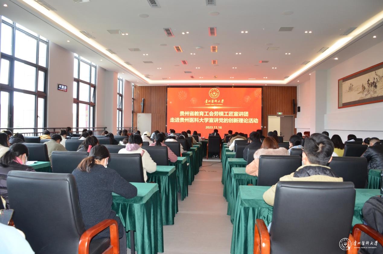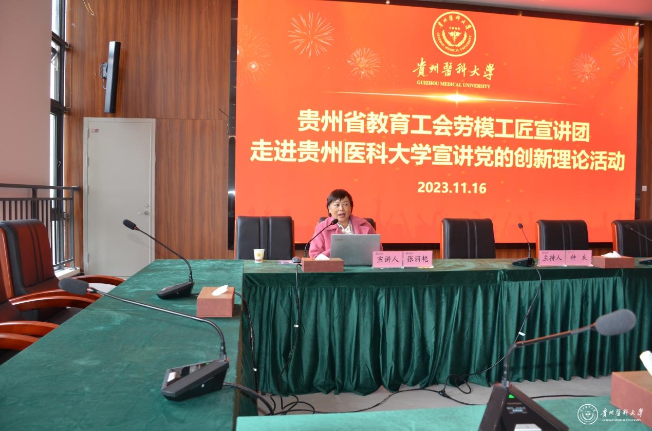 11月16日,贵州省教育工会“劳模工匠宣讲团走进beat365在线唯一官网宣讲党的创新理论”活动在beat365云漫湖校区举行。贵州省教育工会“劳模工匠宣讲团”成员、“全国五一劳动奖章”“全国五一巾帼标兵”“贵州省脱贫攻坚优秀党员”“贵州省最美科技工作者”和贵州省农村产业革命中药材产业“先进个人”获得者贵州省中医药大学张丽艳教授作宣讲,校工会全体工作人员和相关教职员工参加。