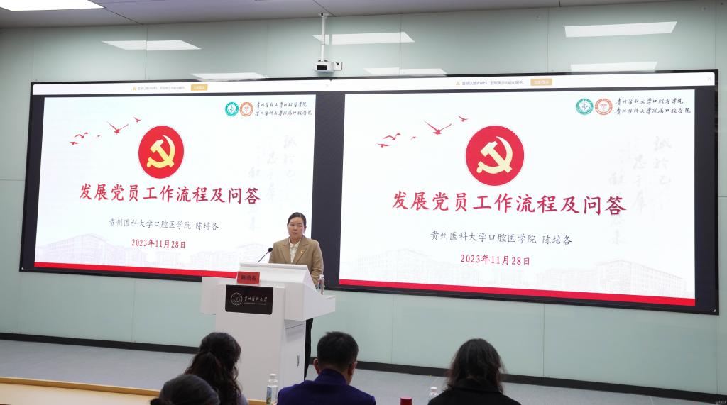 口腔医学院副科级组织员陈培各从发展党员的总体要求和原则、发展党员工作流程、发展党员工作问答三方面对新时期发展党员工作,该如何进一步规范发展党员工作程序进行培训。