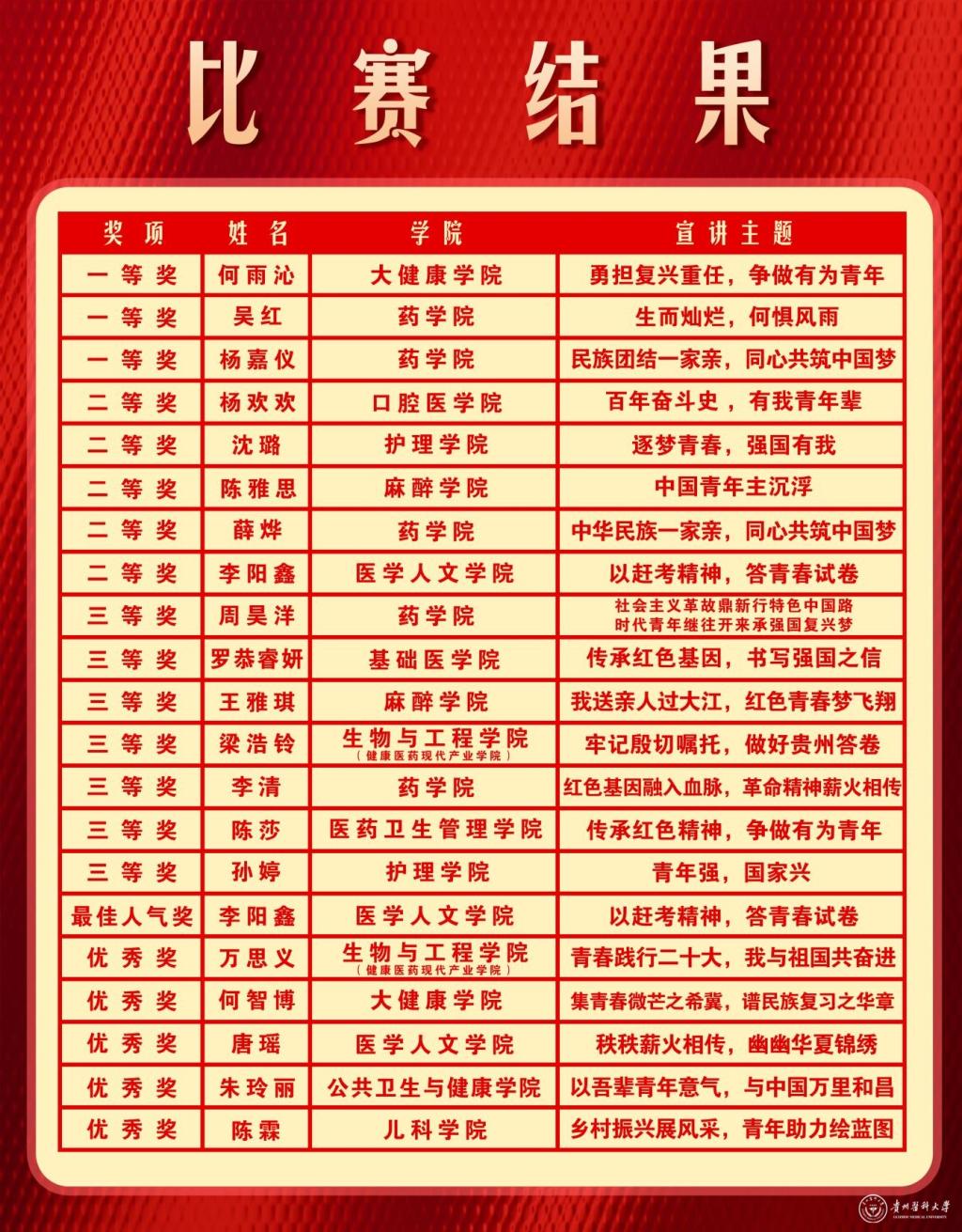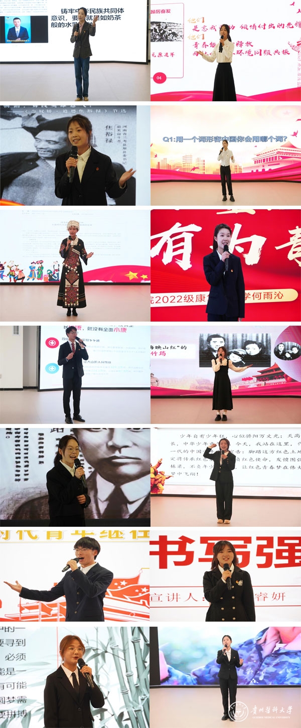 用青春的力量传播党的声音,用蓬勃的朝气诠释思想的活力。校团委将以此次大赛之契机,着力强化青年理论武装,加大青年学生理论宣讲队伍建设,为青年学生搭建更多理论宣讲、交流展示和成长进步的舞台,引导广大贵医青年矢志接力奋斗,在强国建设、民族复兴伟业中挺膺担当。