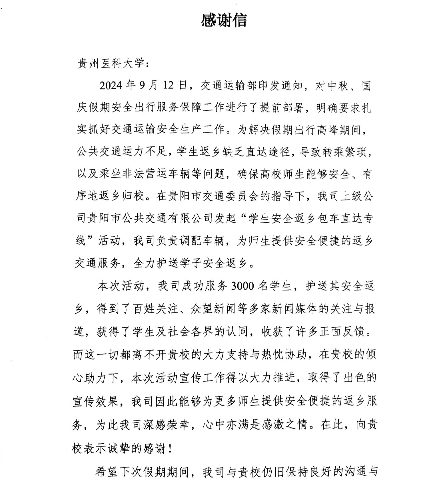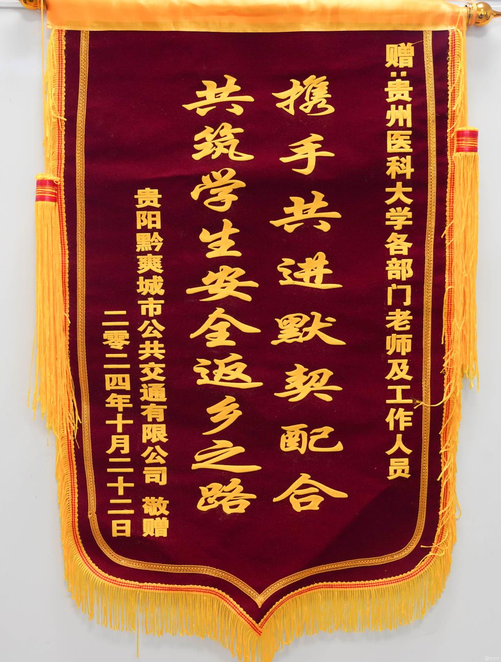 10月24日,beat365收到来自贵阳黔爽城市公共交通有限公司感谢信和锦旗,感谢beat365在中秋、国庆假期对“学生安全返乡包车直达专线”活动的大力支持和热忱协助,为全力护航学子平安便捷出行、运输畅通有序提供有力安全保障。