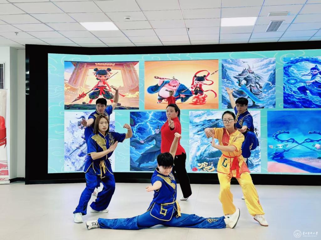 班会以电影《哪吒之魔童闹海》的经典片段为切入点,通过影片中蕴含的传统文化和武术元素,激发了同学们的浓厚兴趣。国家一级武术运动员、辅导员吁莉带领学生进行了精彩的武术表演,现场结合“村超”、独竹漂、安顺地戏等民族特色活动内容,充分展现了中华优秀传统文化的独特魅力。