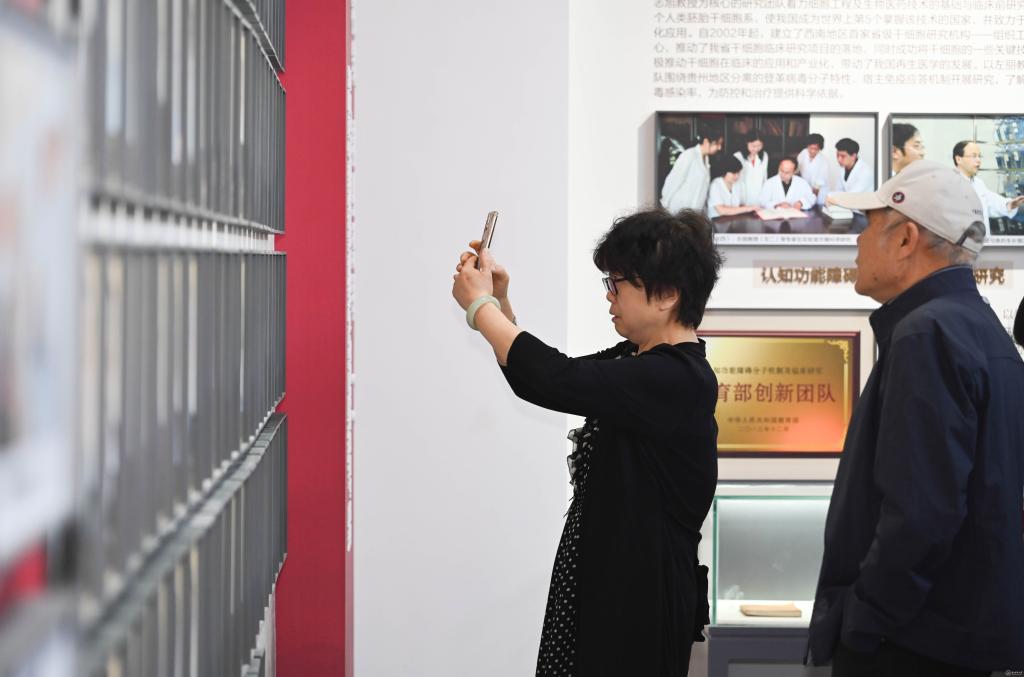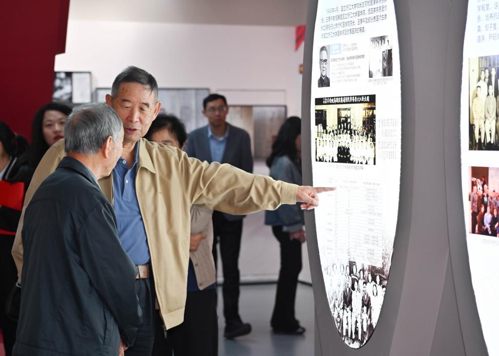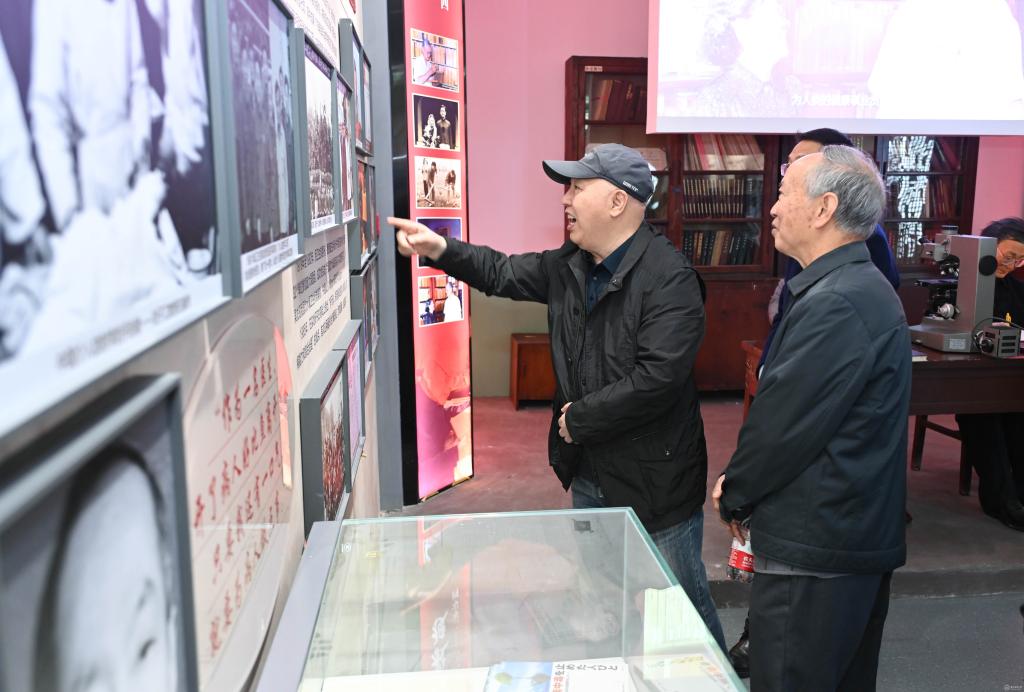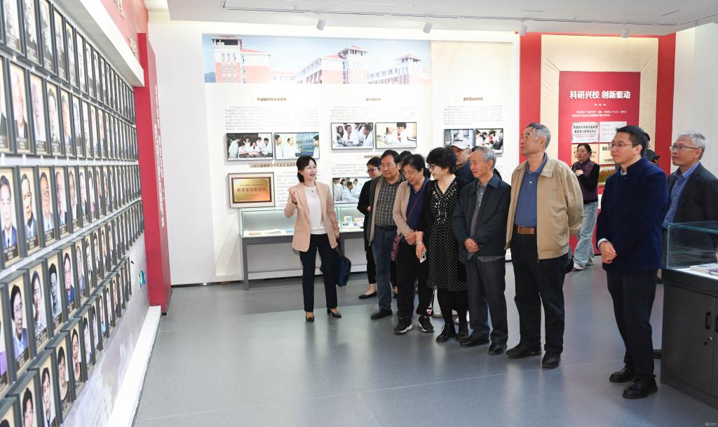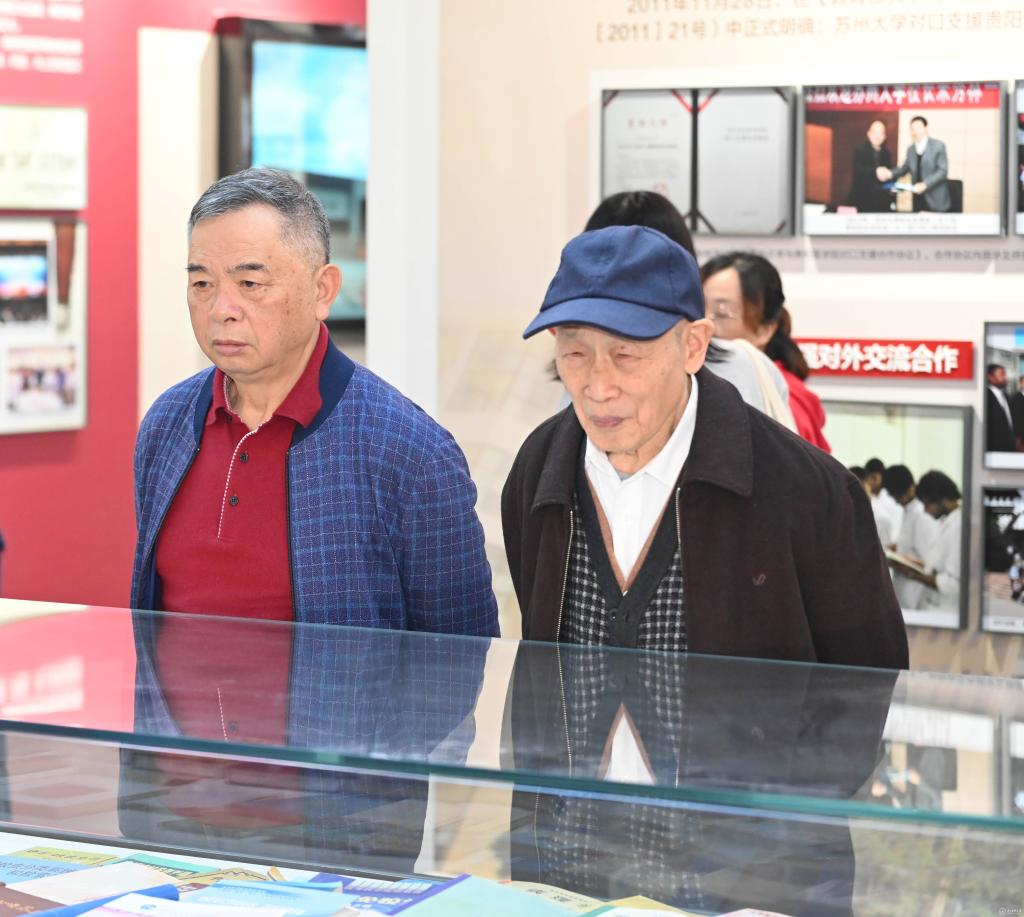 走进校史馆,“五老”代表们重走了学校办学发展之路,共同回忆一段段的光辉岁月,从建校初期的阳明路庙宇校舍、六广门外“草棚大学”、湘雅村校园到北京路校园、花溪大学城校区再到如今的云漫湖校区,每一个历史阶段都在精心设计的展厅中生动呈现。珍贵的照片、详实的史料、熟悉的教具、重现的影像,吸引着他们的目光,时而驻足凝视,时而相互交流,充满对往昔岁月的真情记忆,他们指着墙上的老照片,分享了许多校史资料中未曾记载的感人细节,向身旁的年轻老师讲述起学校在不同历史时期与国家同呼吸、共命运的故事,言语间满是自豪与欣慰。