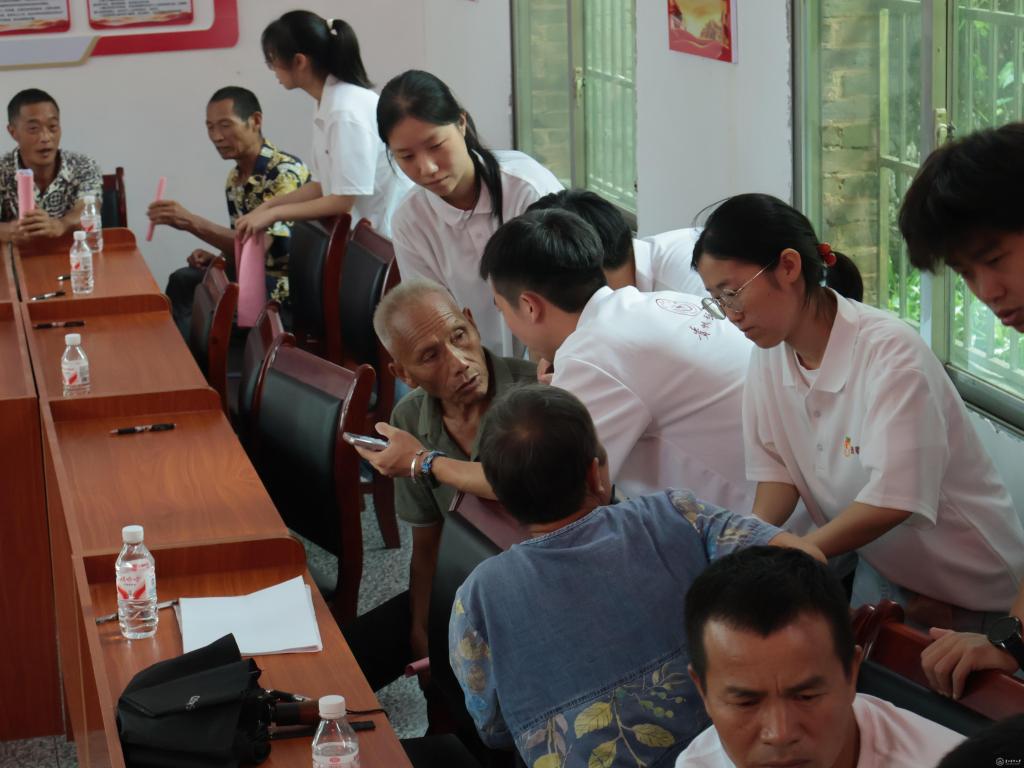 黔山如黛,青瓦生烟。实践队跟随蜜蜂村驻村第一书记陈帅帅穿行于古朴村巷,在探访村中长者时,一幅动人的画面徐徐展开:陈帅帅俯身半跪,指尖轻搭在患胃疾老人的腕间,“夜里起夜还频繁吗?”“那味药得就着热粥喝才舒坦”,问诊声混着蝉鸣,把药理知识酿成了乡音里的絮语。老人们眼角的笑纹盛着信任,队员们在一旁默默学习,心底正悄悄生长着对“医者”二字的新注解。