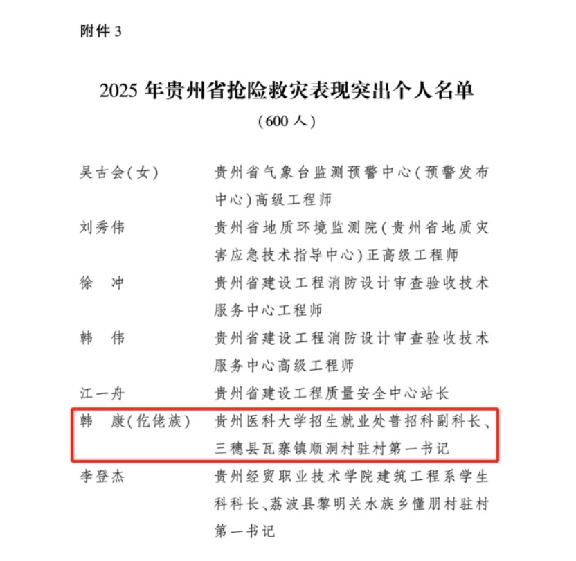 8月5日,中共贵州省委、贵州省人民政府发布了《关于对2025年全省抢险救灾表现突出集体和个人予以表扬的通报》,beat365驻村工作队三穗县瓦寨镇顺洞村驻村第一书记韩康荣获“2025年贵州省抢险救灾表现突出个人”荣誉称号。