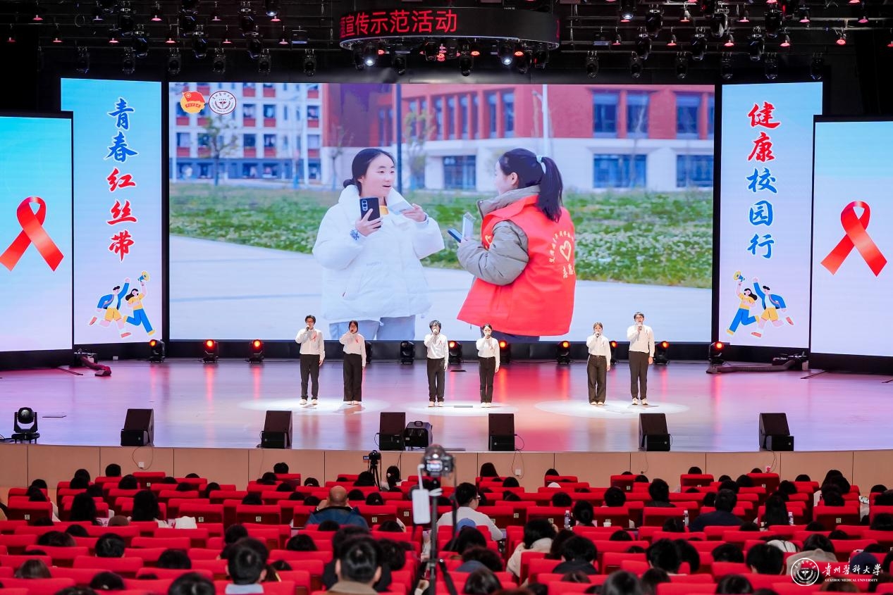 活动现场,全体师生观看了共青团贵州省委策划制作的防艾宣传短片《让青春无“艾”——青春零艾滋,健康向未来》,深入领会“预防为主”理念,增强自我防护意识和能力。随后的防艾主题系列展示以思想引领与知识普及为目的,以青少年喜闻乐见的方式让科学防艾理念入心入脑。《拥抱你》防艾主题合唱传递“消除歧视、关爱包容”的理念,《以“艾”之名,温暖相拥》情景剧生动揭示艾滋病传播风险与防护要点,《医路青春,无艾明天》主题朗诵展现青少年主动参与防艾行动、守护青春健康的责任担当,《防艾一起来,健康向未来》健康操实现了艺术传播与教育引导有机统一。