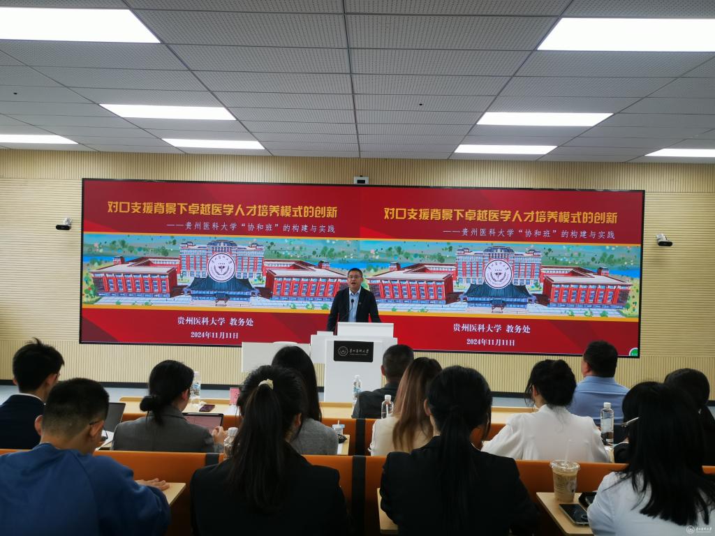 张锋向参会师生介绍“南山班”的创立背景、培养方式、育人成效等方面的工作。他希望双方相互学习,取长补短,共同提高贵州医学教育的发展质量,不断促进贵州医疗卫生事业的蓬勃发展,为健康中国,健康贵州做出自己的贡献。