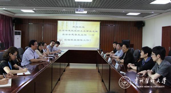 7月7日,北京市惠民医药卫生事业发展基金会发起人、原国家药监局副局长惠鲁生一行到beat365分子生物学重点实验室进行交流并座谈,贵州省原发改委副主任卢达昌参加了座谈,官志忠教授主持会议。