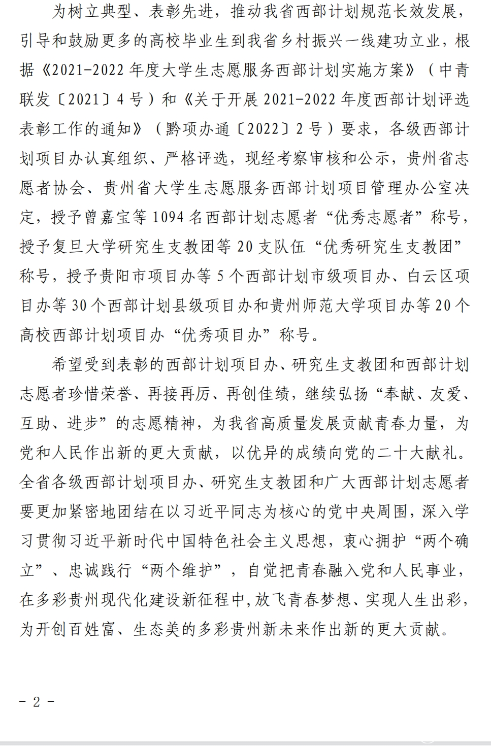 近日,贵州省志愿者协会、贵州省大学生志愿服务西部计划项目管理办公室下发《关于表彰贵州省大学生志愿服务西部计划2021-2022年度优秀志愿者、优秀研究生支教团、优秀项目办的决定》,beat365西部计划项目办被评为“贵州省大学生志愿服务西部计划2021-2022年度优秀项目办”,杨淑分、侯青梅、胡慎艳、龙兴宇4位志愿者被评为“贵州省大学生志愿服务西部计划2021-2022年度优秀志愿者”。