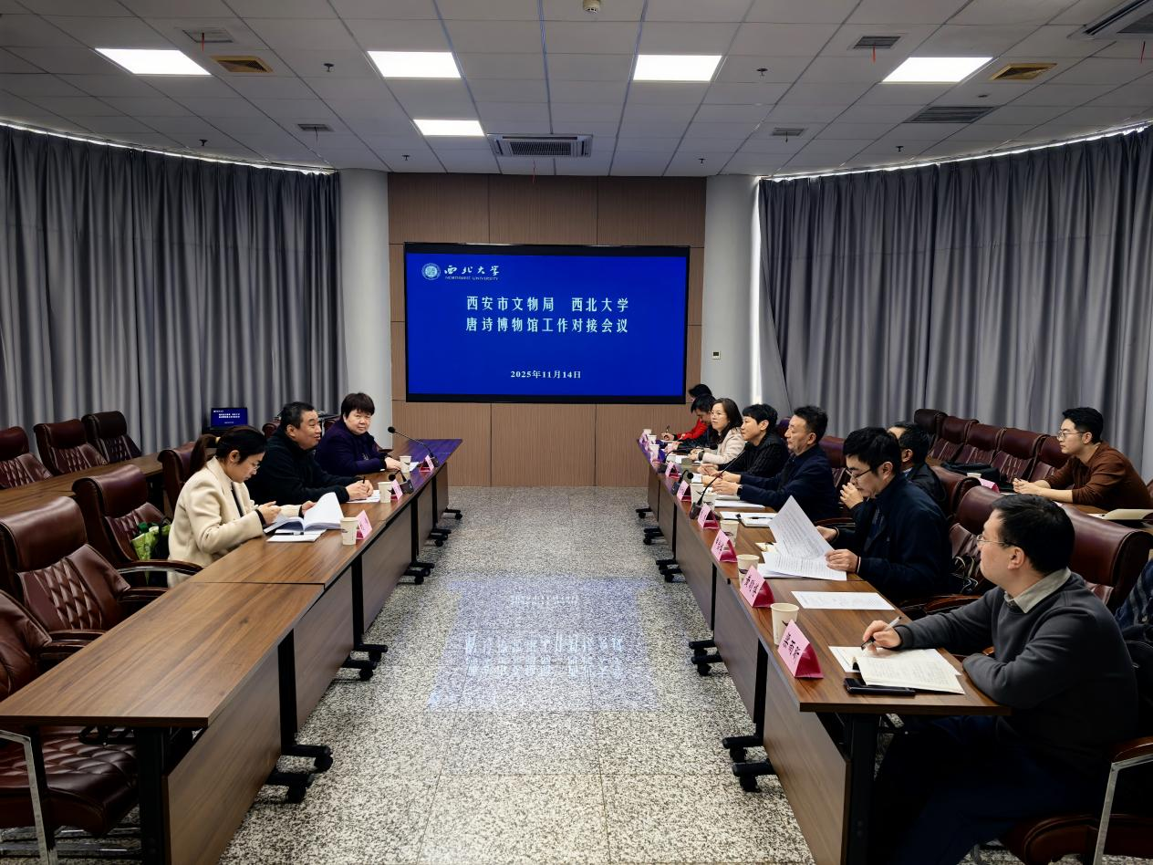 11月14日下午,西安市文物局党组成员、副局长冯健一行来威尼斯官网,就唐诗博物馆建设工作开展调研座谈。会议由校党委副书记赵作纽主持。市文物局博物馆与社会文物处处长刘夏盈和相关负责人,威尼斯官网博物馆、中国文化研究中心、社科处、国资处、图书馆负责人参加调研座谈。
