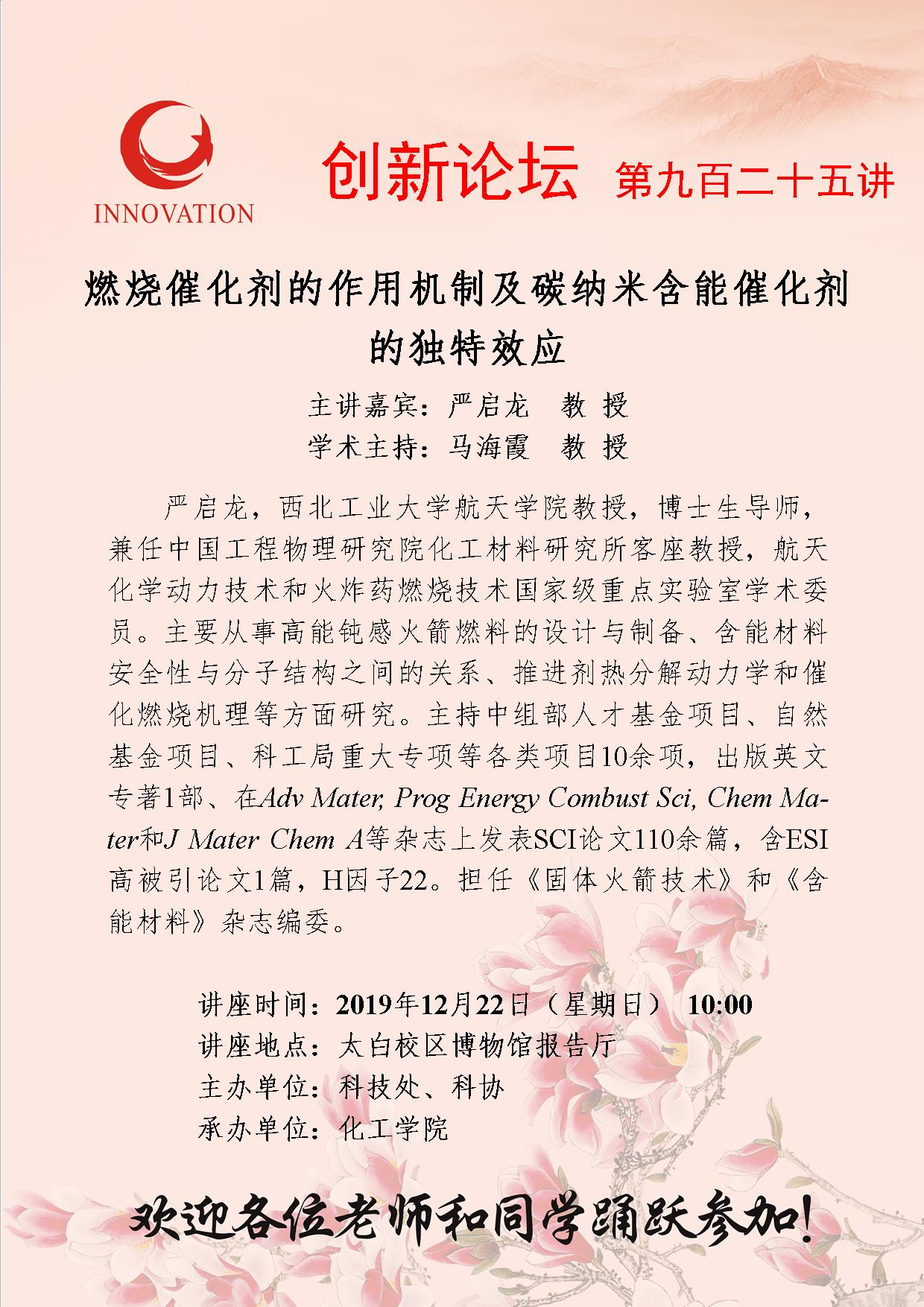 严启龙 welcome欢迎光临威尼斯集团创新论坛第九百二十五讲:燃烧催化剂的作用机制及碳纳米含能催化剂的独特效应 讲座时间 2019年12月22日(星期日) 10:00 讲座地点 太白校区博物馆报告厅 讲座人介绍 严启龙 讲座内容