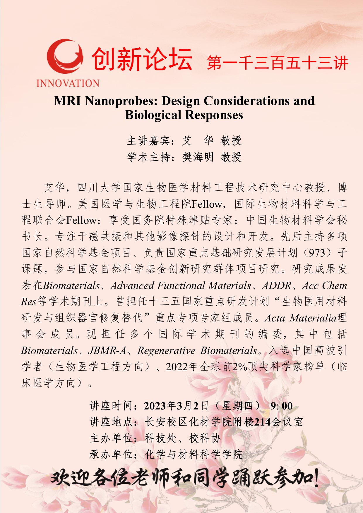 艾华 教授 welcome欢迎光临威尼斯集团创新论坛第一千三百五十三讲:MRI Nanoprobes: Design Considerations and Biological Responses 讲座时间 2023年3月2日(星期四) 9: 00 讲座地点 长安校区化材学院附楼214会议室 讲座人介绍 艾华 教授 讲座内容