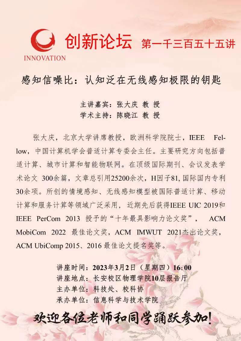 张大庆 教授 welcome欢迎光临威尼斯集团创新论坛第一千三百五十五讲:感知信噪比:认知泛在无线感知极限的钥匙 讲座时间 2023年3月2日(星期四)16:00 讲座地点 长安校区物理学院10层报告厅 讲座人介绍 张大庆 教授 讲座内容