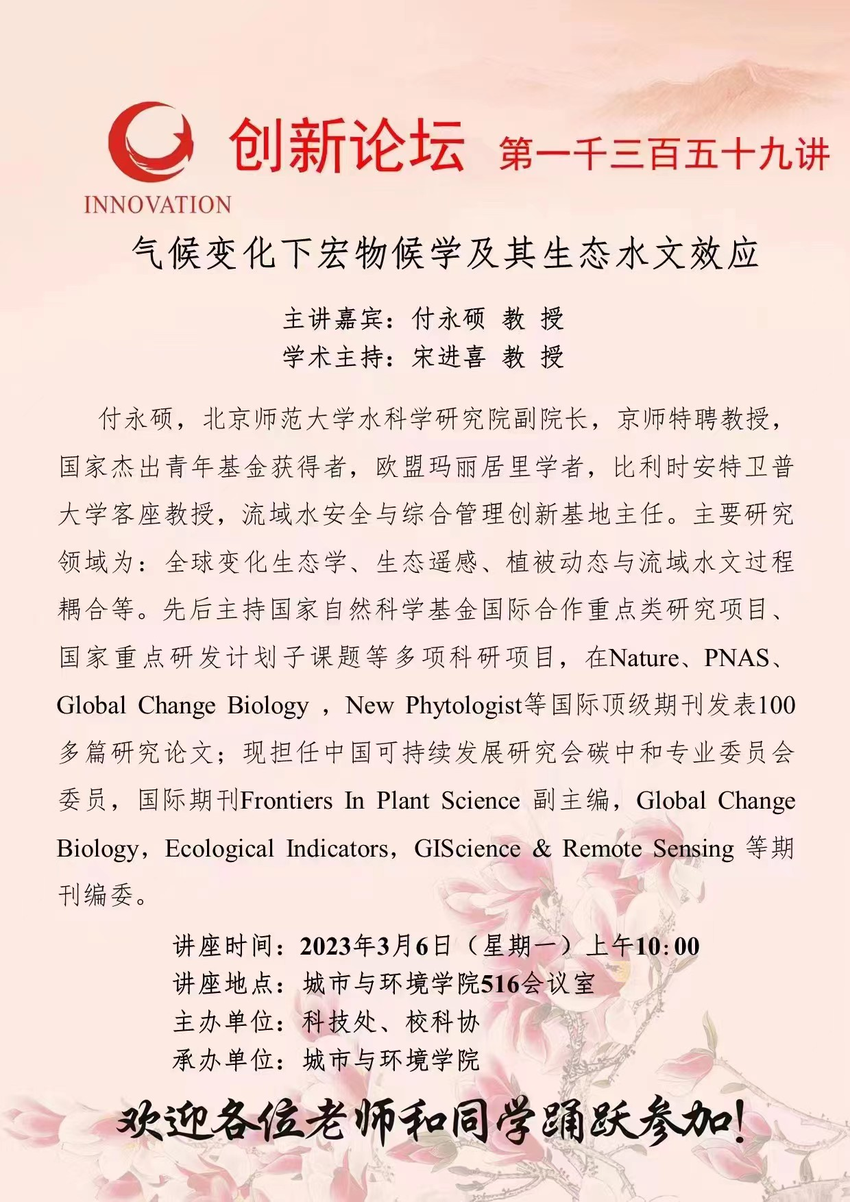 welcome欢迎光临威尼斯集团创新论坛第一千三百五十九讲:气候变化下宏物候学及生态水文效应 讲座时间 2023年3月6日(星期一)上午10:00 讲座地点 城市与环境学院516会议室 讲座人介绍 讲座内容