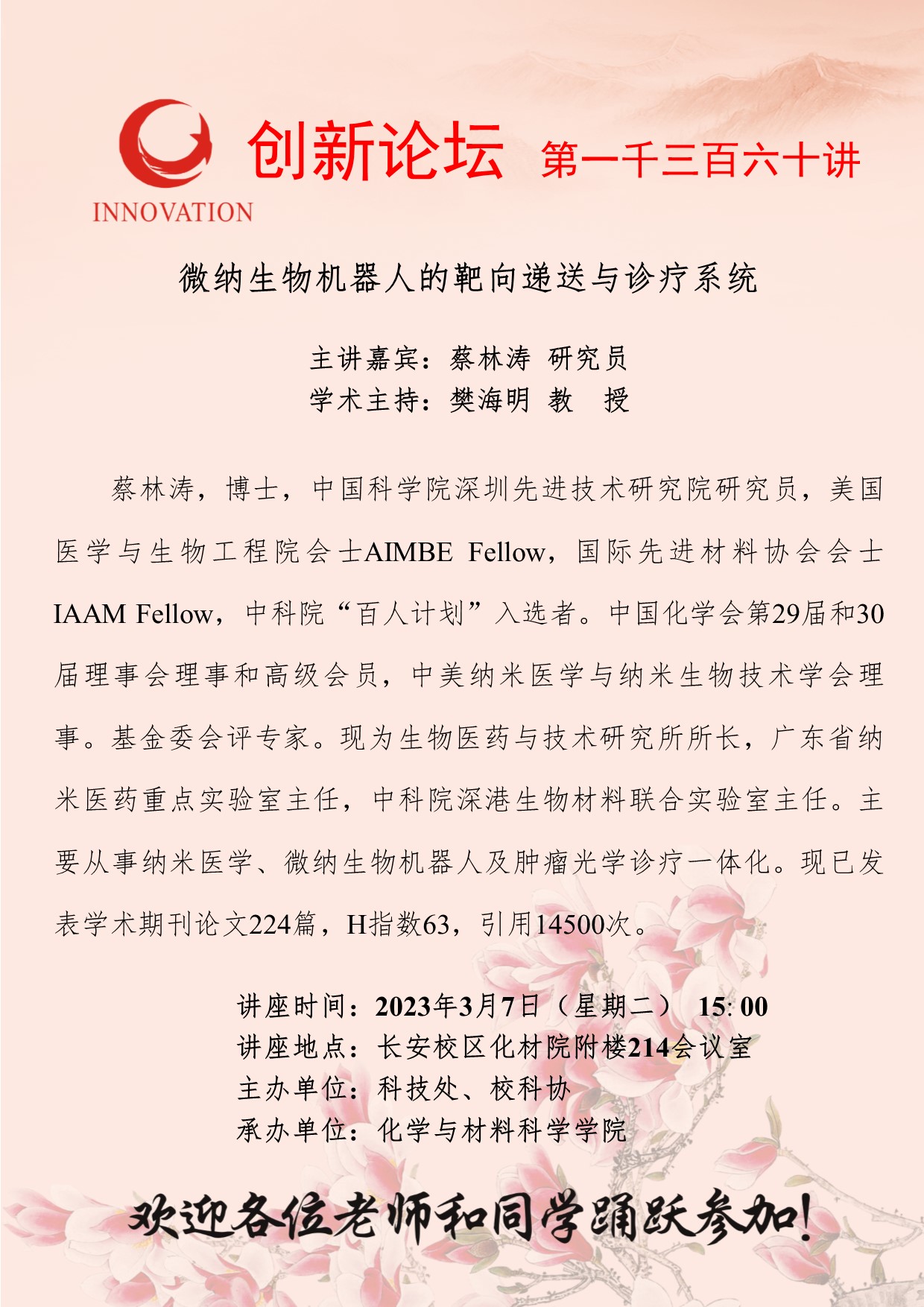 蔡林涛 研究员 welcome欢迎光临威尼斯集团创新论坛第一千三百六十讲:微纳生物机器人的靶向递送与诊疗系统 讲座时间 2023年3月7日(星期二) 15: 00 讲座地点 长安校区化材院附楼214会议室 讲座人介绍 蔡林涛 研究员 讲座内容