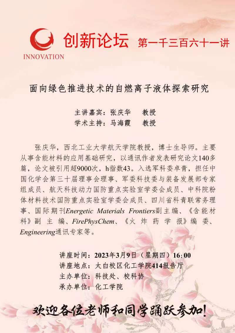 张庆华 教授 welcome欢迎光临威尼斯集团创新论坛第一千三百六十一讲:面向绿色推进技术的自燃离子液体探索研究 讲座时间 2023年3月9日(星期四)16:00 讲座地点 太白校区化工学院414报告厅 讲座人介绍 张庆华 教授 讲座内容