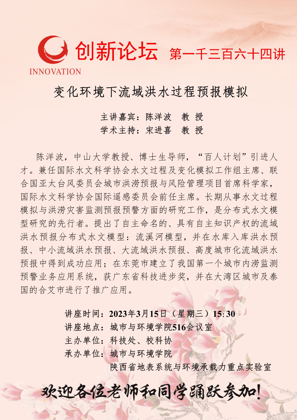 陈洋波 教授 welcome欢迎光临威尼斯集团创新论坛第一千三百六十四讲:变化环境下流域洪水过程预报模拟 讲座时间 2023年3月15日(星期三)15:30 讲座地点 城市与环境学院516会议室 讲座人介绍 陈洋波 教授 讲座内容