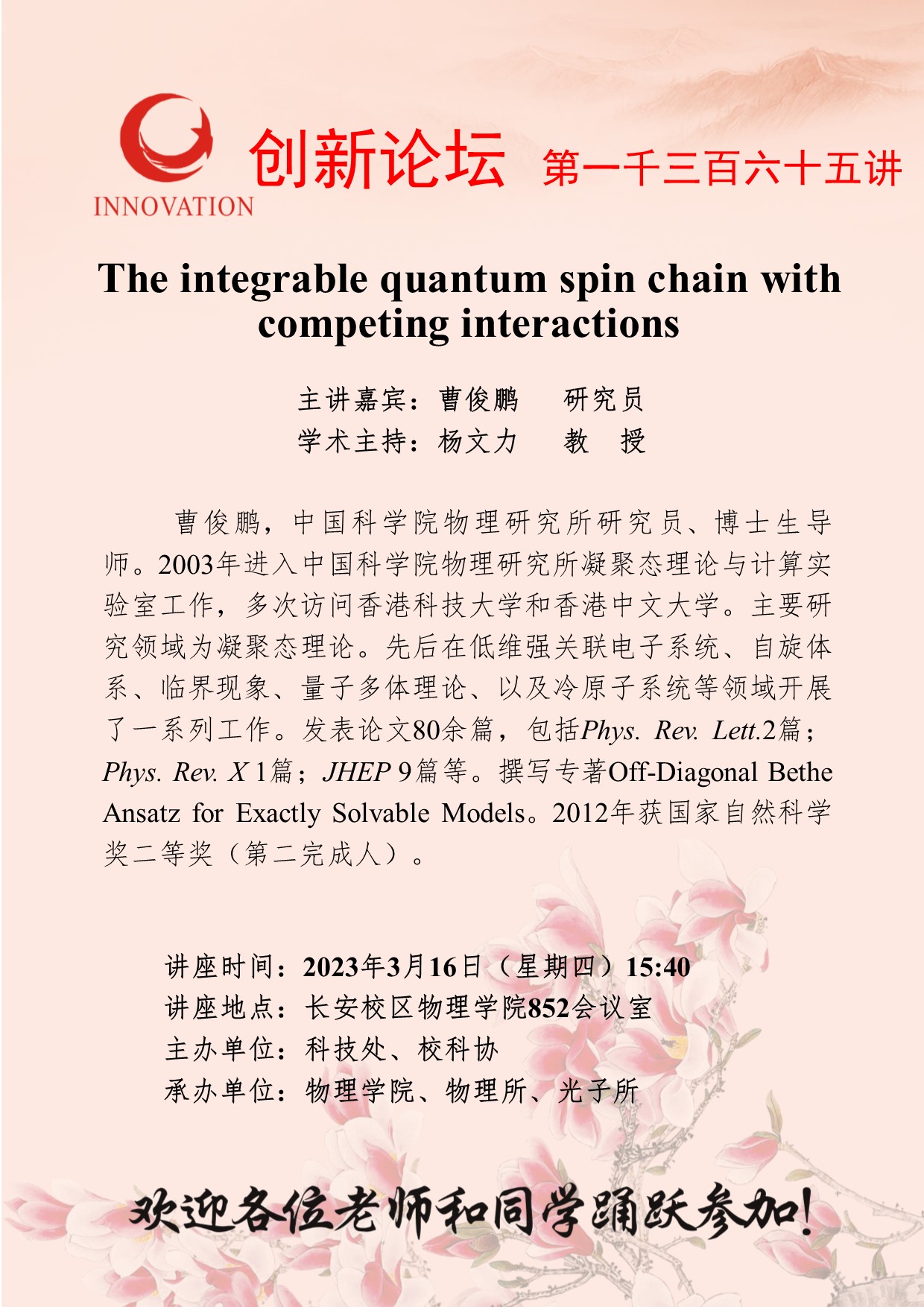 曹俊鹏 研究员 welcome欢迎光临威尼斯集团创新论坛第一千三百六十五讲:The integrable quantum spin chain with competing interactions 讲座时间 2023年3月16日(星期四)15:40 讲座地点 长安校区物理学院852会议室 讲座人介绍 曹俊鹏 研究员 讲座内容