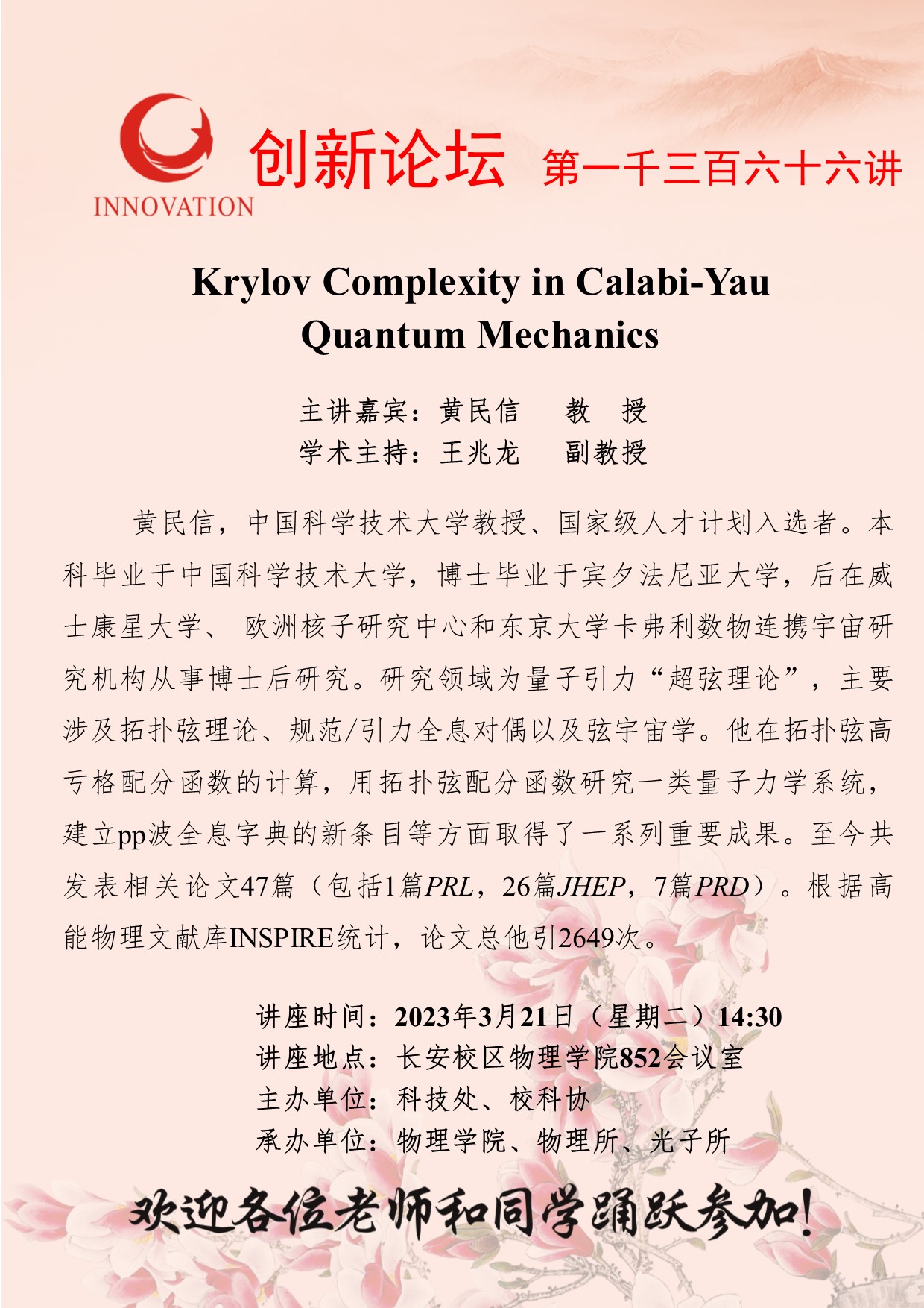 黄民信 教授 welcome欢迎光临威尼斯集团创新论坛第一千三百六十六讲:Krylov Complexity in Calabi-Yau Quantum Mechanics 讲座时间 2023年3月21日(星期二)14:30 讲座地点 长安校区物理学院852会议室 讲座人介绍 黄民信 教授 讲座内容