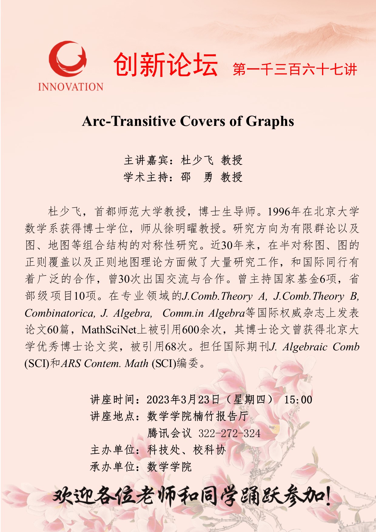 杜少飞 教授 welcome欢迎光临威尼斯集团创新论坛第一千三百六十七讲:Arc-Transitive Covers of Graphs 讲座时间 2023年3月23日(星期四) 15:00 讲座地点 数学学院楠竹报告厅、腾讯会议 322-272-324 讲座人介绍 杜少飞 教授 讲座内容