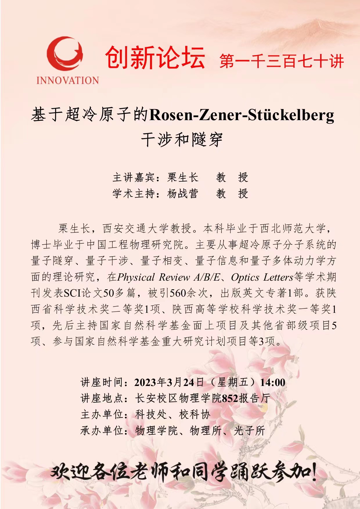 栗生长 教 授 welcome欢迎光临威尼斯集团创新论坛第一千三百七十讲:基于超冷原子的Rosen-Zener-Stückelberg干涉和隧穿 讲座时间 2023年3月24日(星期五)14:00 讲座地点 长安校区物理学院852报告厅 讲座人介绍 栗生长 教 授 讲座内容