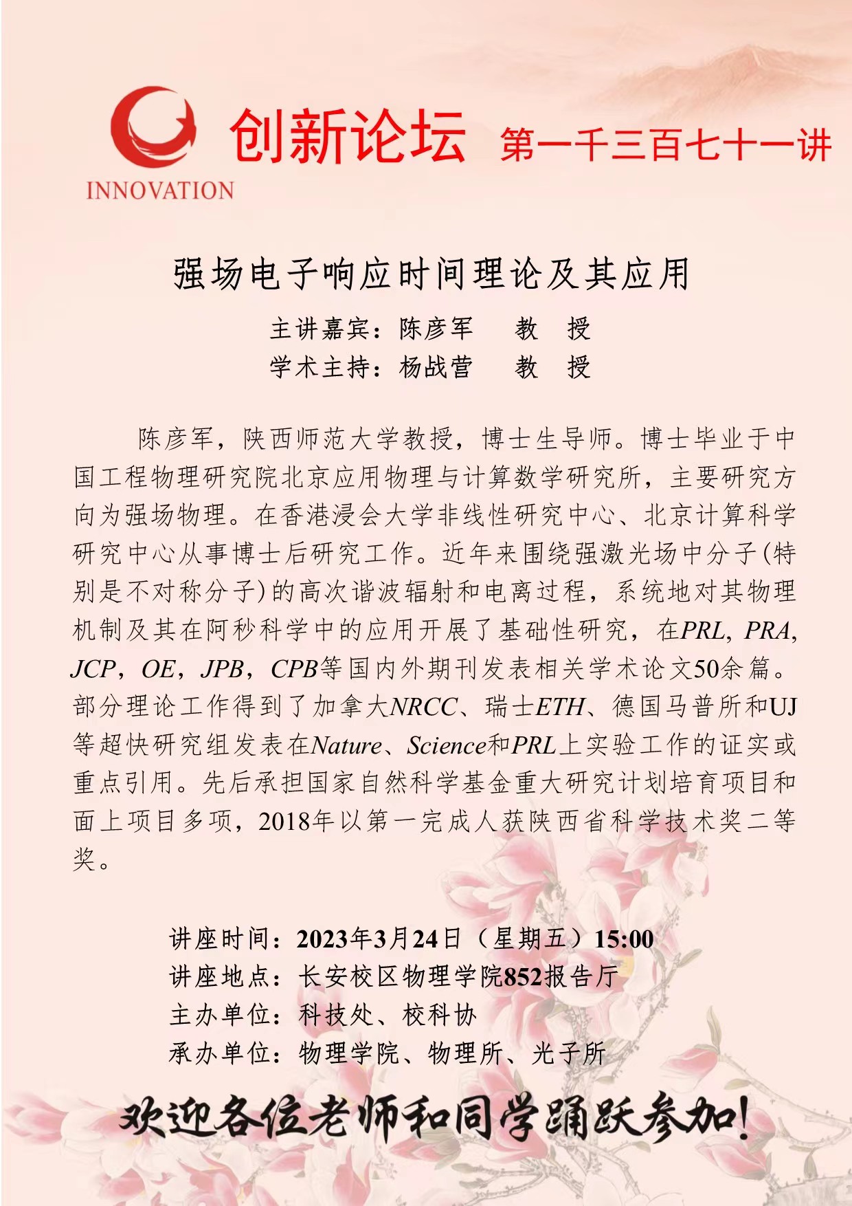 陈彦军 教 授 welcome欢迎光临威尼斯集团创新论坛第一千三百七十一讲:强场电子响应时间理论及其应用 讲座时间 2023年3月24日(星期五)15:00 讲座地点 长安校区物理学院852报告厅 讲座人介绍 陈彦军 教 授 讲座内容