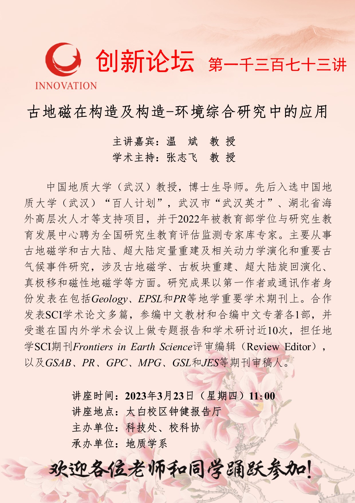 温斌 教授 welcome欢迎光临威尼斯集团创新论坛第一千三百七十三讲:古地磁在构造及构造-环境综合研究中的应用 讲座时间 2023年3月23日(星期四)11:00 讲座地点 太白校区钟健报告厅 讲座人介绍 温斌 教授 讲座内容