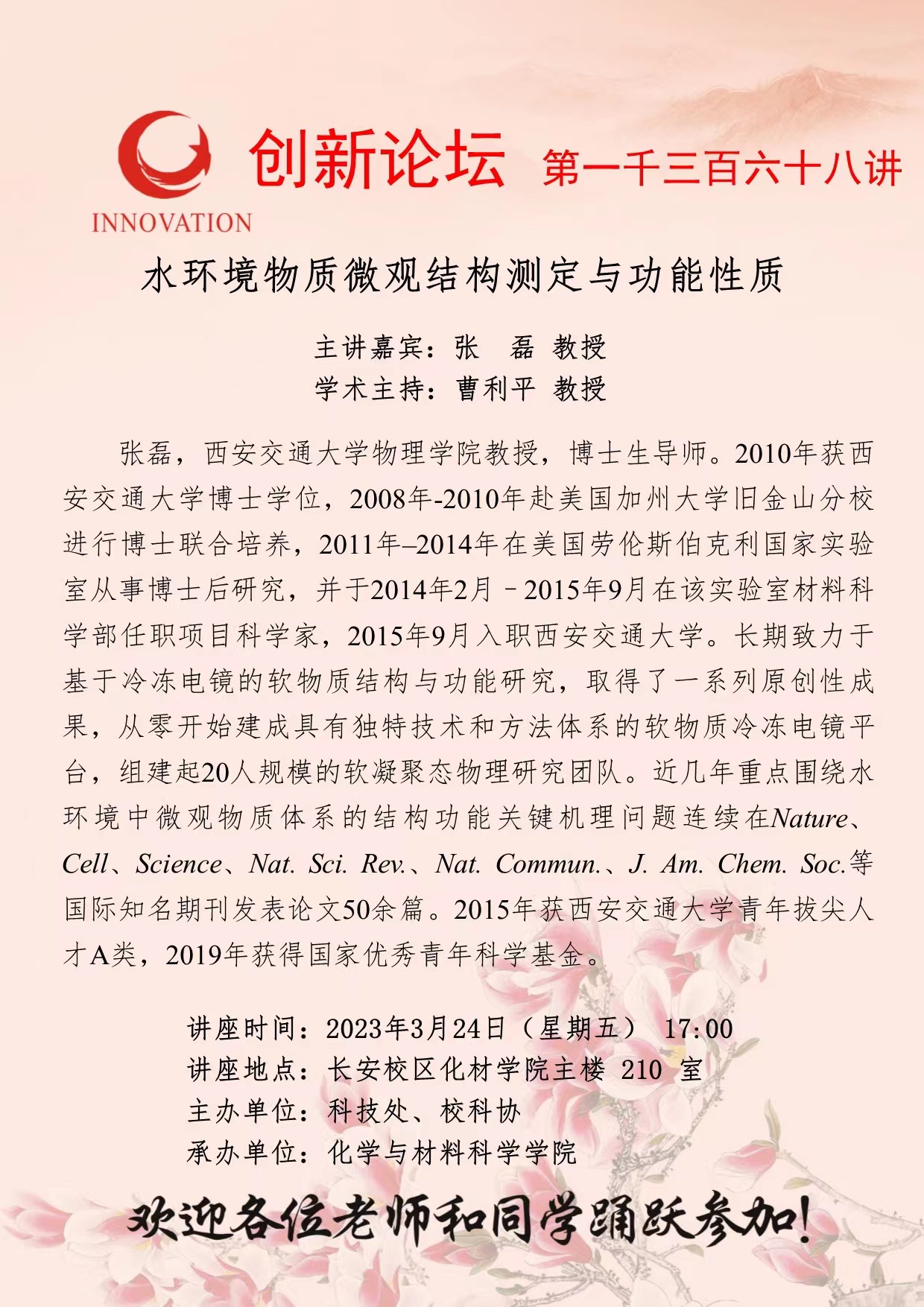 张磊 教授 welcome欢迎光临威尼斯集团创新论坛第一千三百六十八讲:水环境物质微观结构测定与功能性质机理 讲座时间 2023年3月24日(星期五) 17:00 讲座地点 长安校区化材学院主楼 210 室 讲座人介绍 张磊 教授 讲座内容