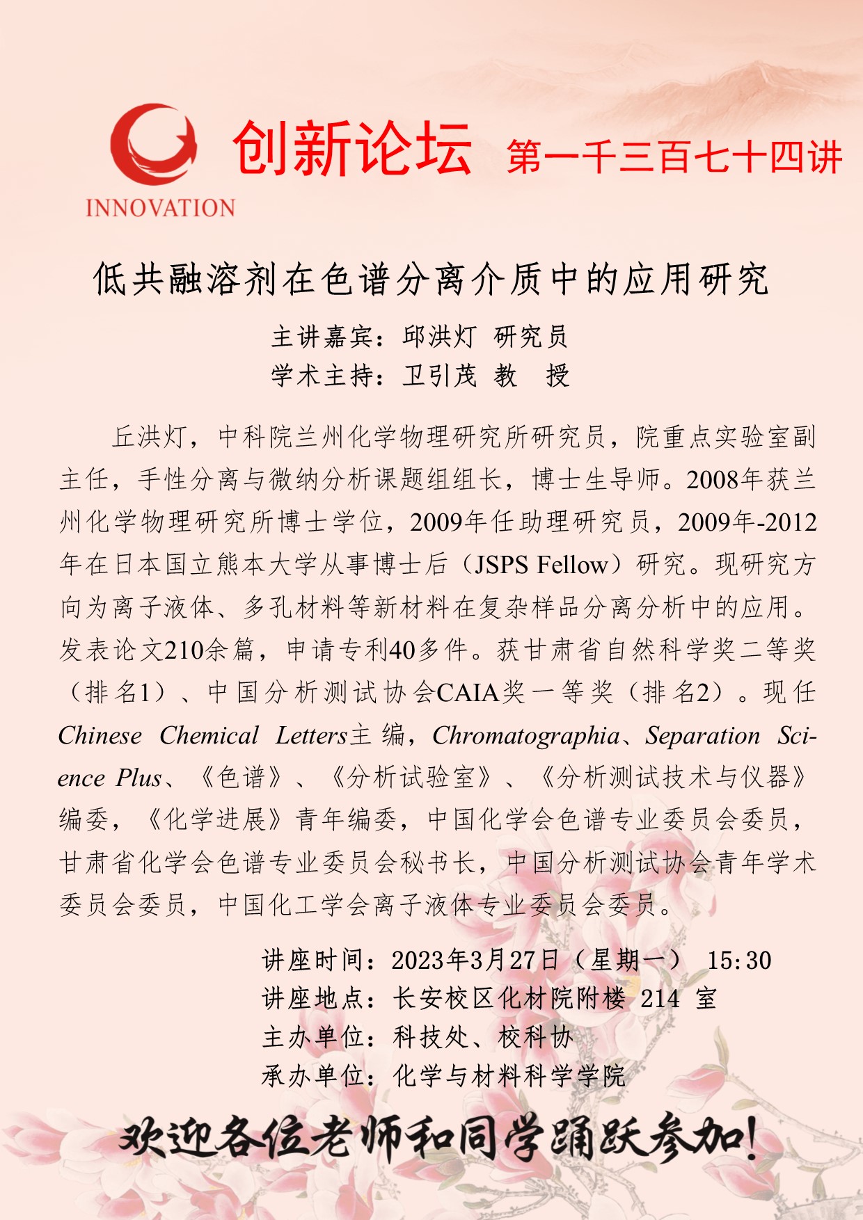 邱洪灯 研究员 welcome欢迎光临威尼斯集团创新论坛第一千三百七十四讲:低共融溶剂在色谱分离介质中的应用研究 讲座时间 2023年3月27日(星期一) 15:30 讲座地点 长安校区化材院附楼214室 讲座人介绍 邱洪灯 研究员 讲座内容