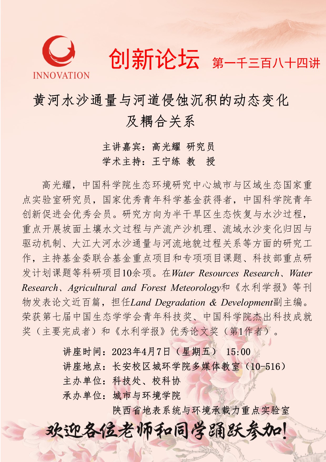 高光耀 研究员 welcome欢迎光临威尼斯集团创新论坛第一千三百八十四讲:黄河水沙通量与河道侵蚀沉积的动态变化及耦合关系 讲座时间 2023年4月7日(星期五) 15:00 讲座地点 长安校区城环学院多媒体教室(10-516) 讲座人介绍 高光耀 研究员 讲座内容