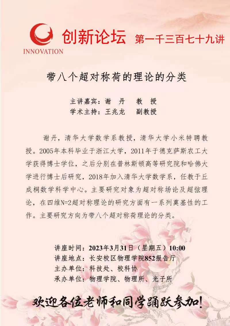 谢丹 教授 welcome欢迎光临威尼斯集团创新论坛第一千三百七十九讲:带八个超对称荷的理论的分类 讲座时间 2023年3月31日(星期五)10:00 讲座地点 长安校区物理学院852报告厅 讲座人介绍 谢丹 教授 讲座内容