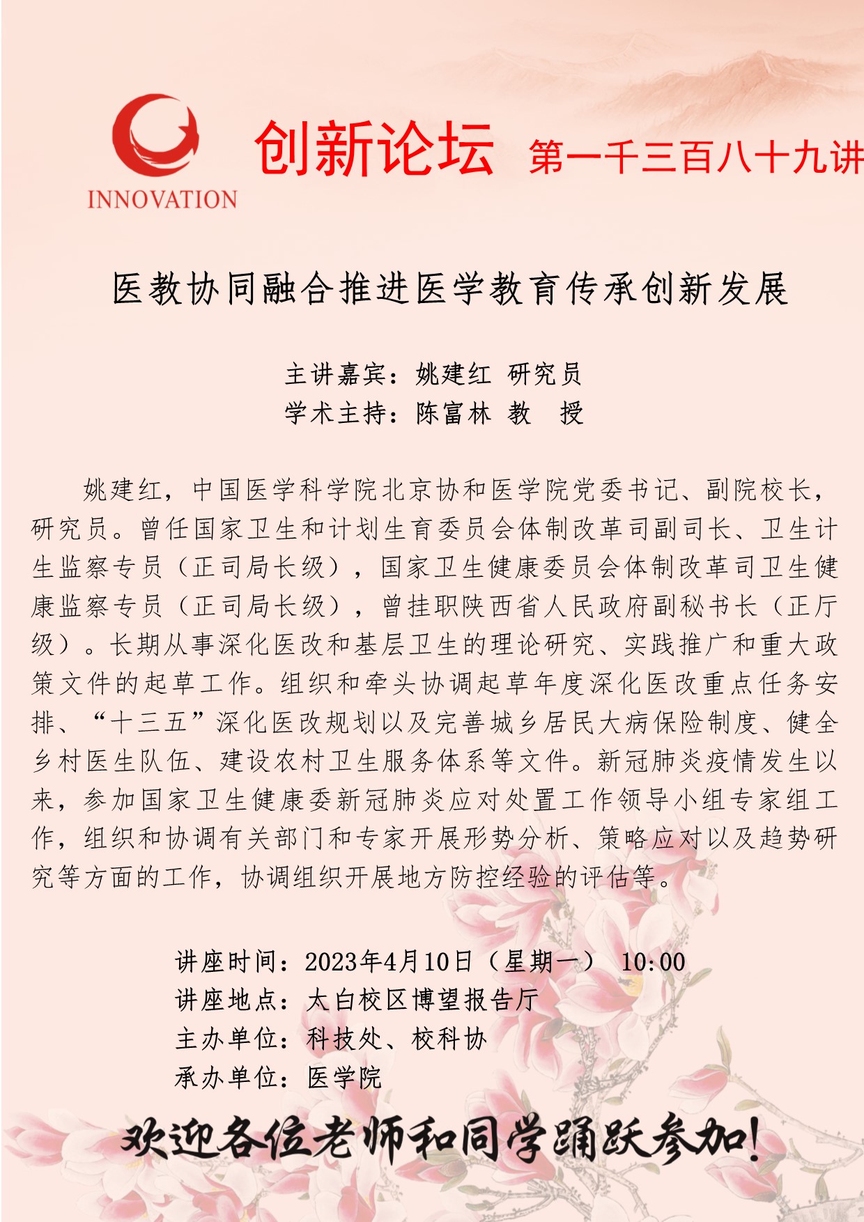 姚建红 研究员 welcome欢迎光临威尼斯集团创新论坛第一千三百八十九讲:医教协同融合推进医学教育传承创新发展 讲座时间 2023年4月10日(星期一) 10:00 讲座地点 太白校区博望报告厅 讲座人介绍 姚建红 研究员 讲座内容