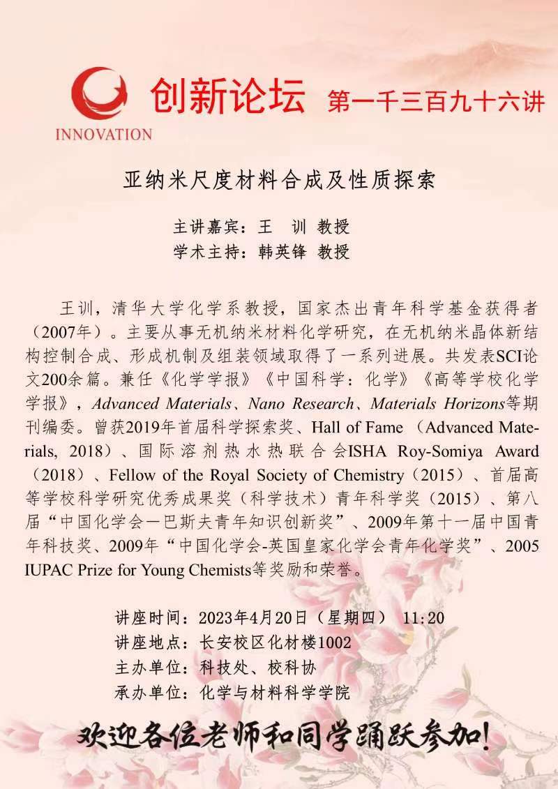 王 训 教授 welcome欢迎光临威尼斯集团创新论坛第一千三百九十六讲:亚纳米尺度材料合成及性质探索 讲座时间 2023年4月20日(星期四) 11:20 讲座地点 长安校区化材楼1002 讲座人介绍 王 训 教授 讲座内容