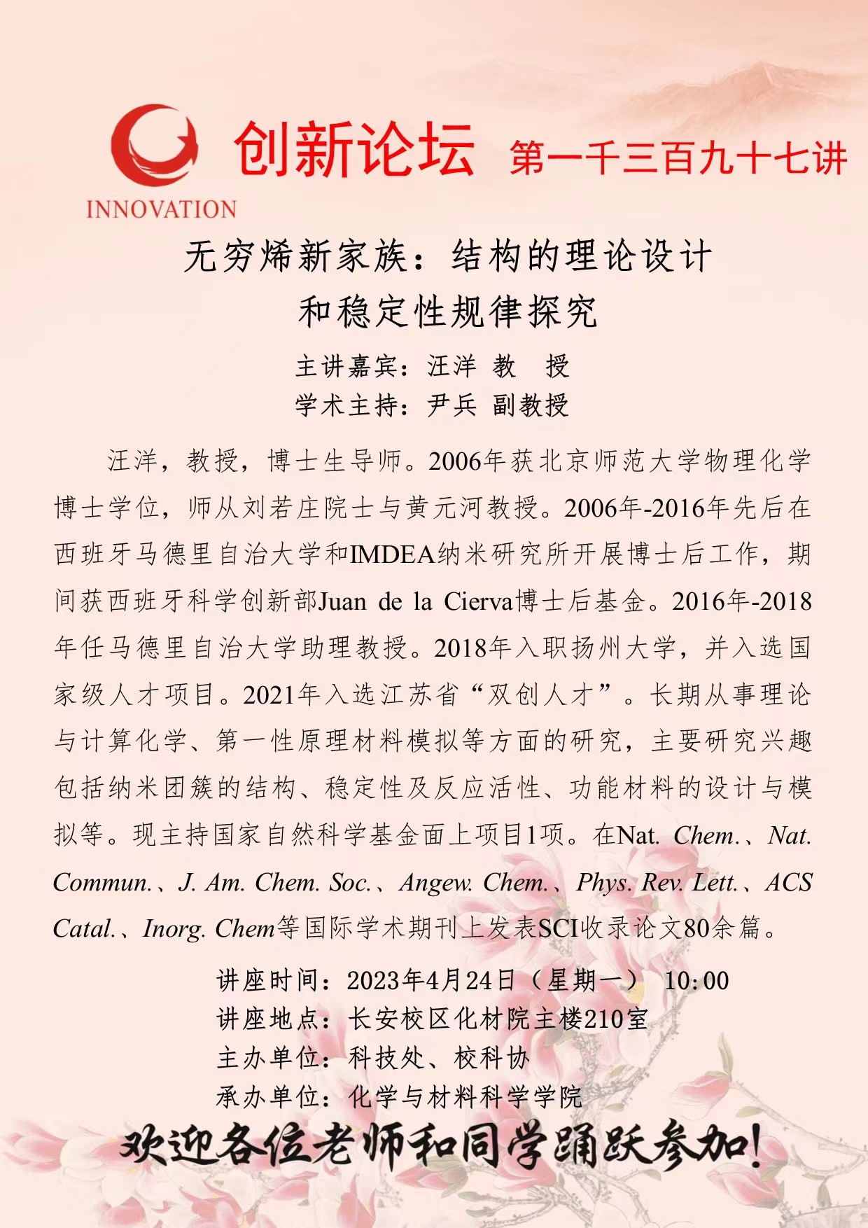 汪洋 教 授 welcome欢迎光临威尼斯集团创新论坛第一千三百九十七讲:无穷烯新家族:结构的理论设计和稳定性规律探究 讲座时间 2023年4月24日(星期一) 10:00 讲座地点 长安校区化材院主楼210室 讲座人介绍 汪洋 教 授 讲座内容