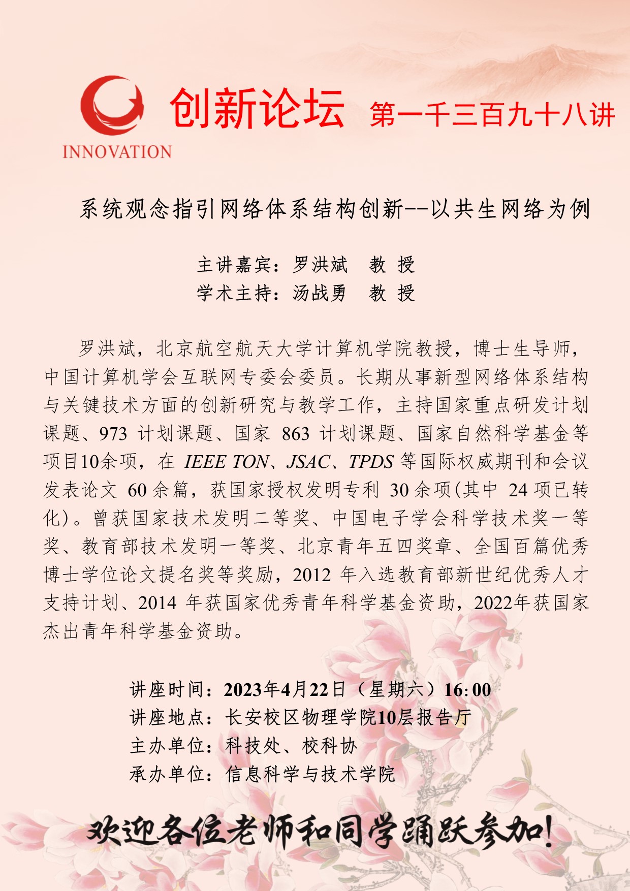 罗洪斌 教 授 welcome欢迎光临威尼斯集团创新论坛第一千三百九十八讲:系统观念指引网络体系结构创新--以共生网络为例 讲座时间 2023年4月22日(星期六)16:00 讲座地点 长安校区物理学院10层报告厅 讲座人介绍 罗洪斌 教 授 讲座内容