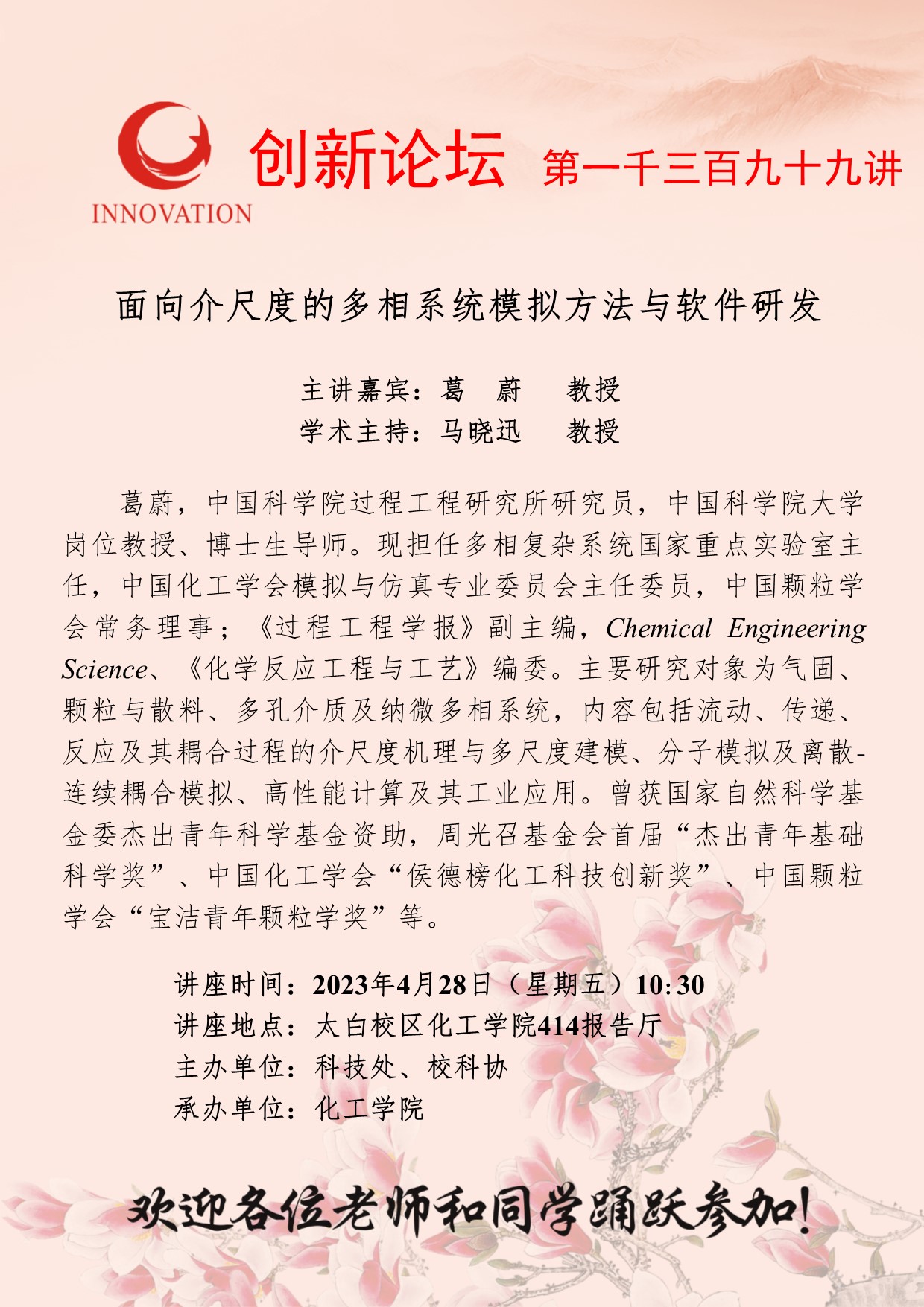 葛蔚 教授 welcome欢迎光临威尼斯集团创新论坛第一千三百九十九讲:面向介尺度的多相系统模拟方法与软件研发 讲座时间 2023年4月28日(星期五)10:30 讲座地点 太白校区化工学院414报告厅 讲座人介绍 葛蔚 教授 讲座内容