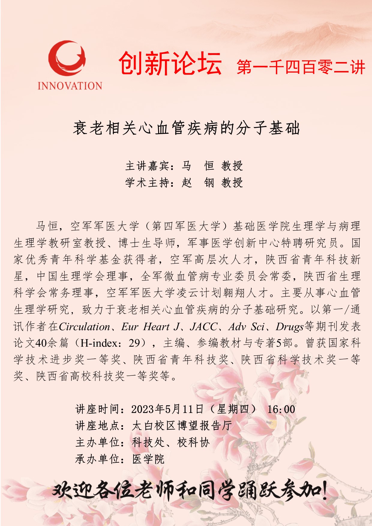 马恒 教授 welcome欢迎光临威尼斯集团创新论坛第一千四百零二讲:衰老相关心血管疾病的分子基础 讲座时间 2023年5月11日(星期四) 16:00 讲座地点 太白校区博望报告厅 讲座人介绍 马恒 教授 讲座内容