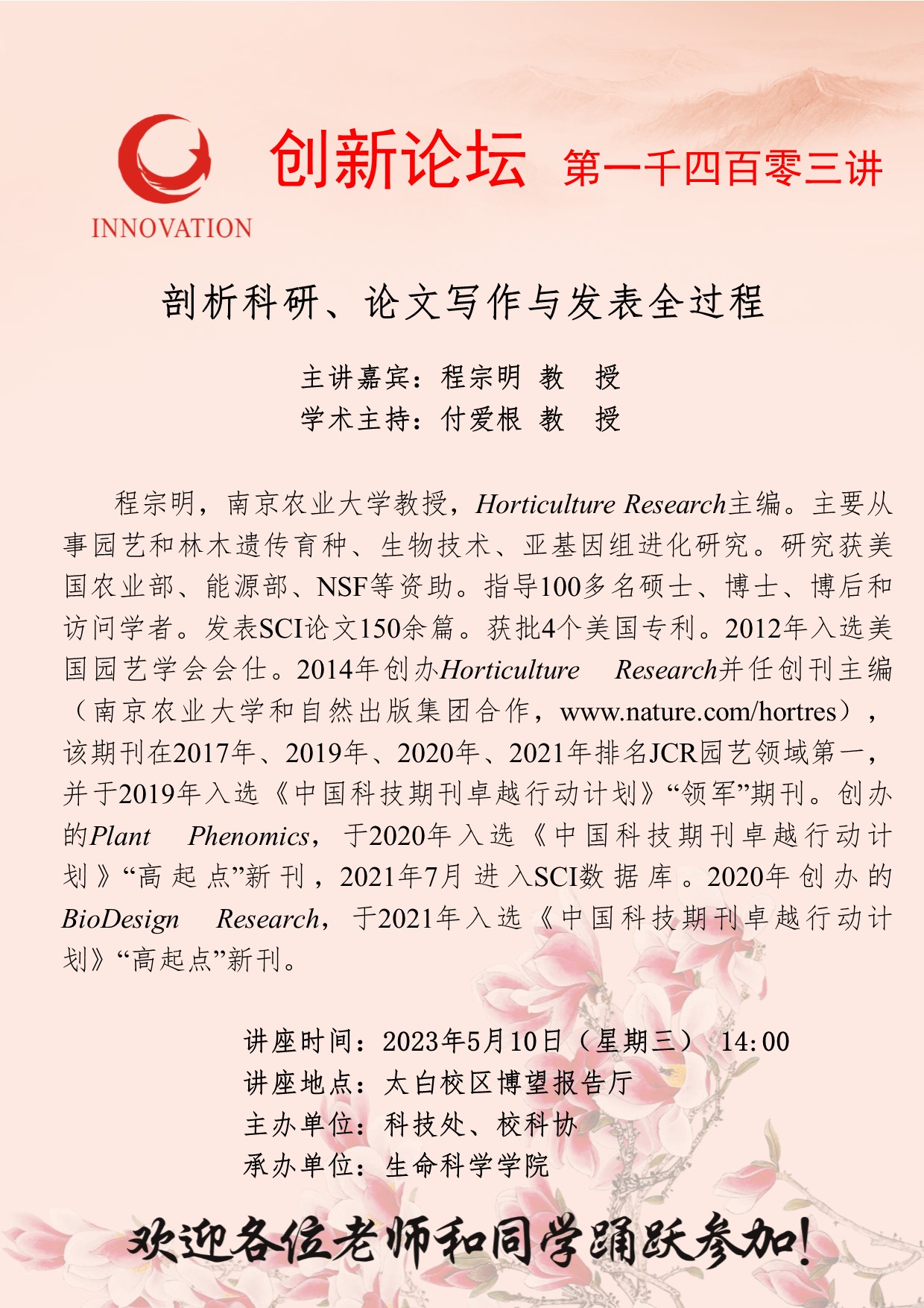 程宗明 教授 welcome欢迎光临威尼斯集团创新论坛第一千四百零三讲:剖析科研、论文写作与发表全过程 讲座时间 2023年5月10日(星期三) 14:00 讲座地点 太白校区博望报告厅 讲座人介绍 程宗明 教授 讲座内容
