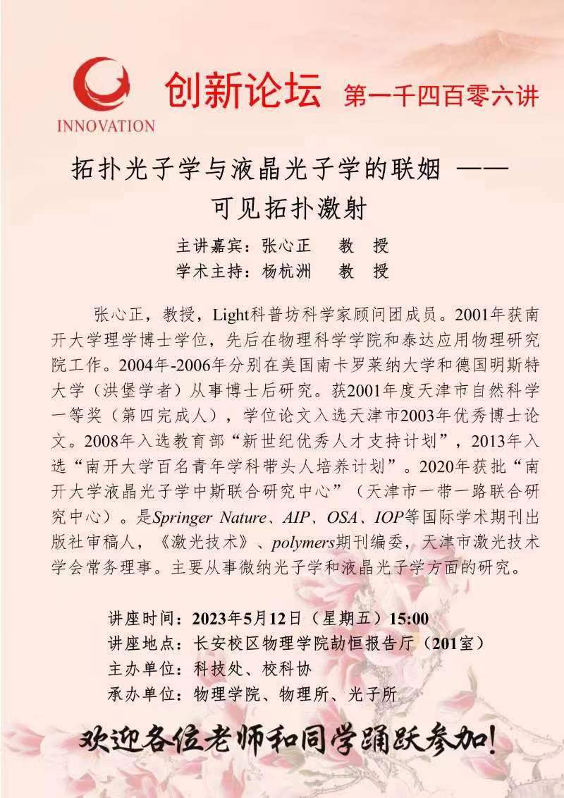 张心正 教 授 welcome欢迎光临威尼斯集团创新论坛第一千四百零六讲:拓扑光子学与液晶光子学的联姻 — 可见拓扑激射 讲座时间 2023年5月12日(星期五)15:00 讲座地点 长安校区物理学院劼恒报告厅(201室) 讲座人介绍 张心正 教 授 讲座内容