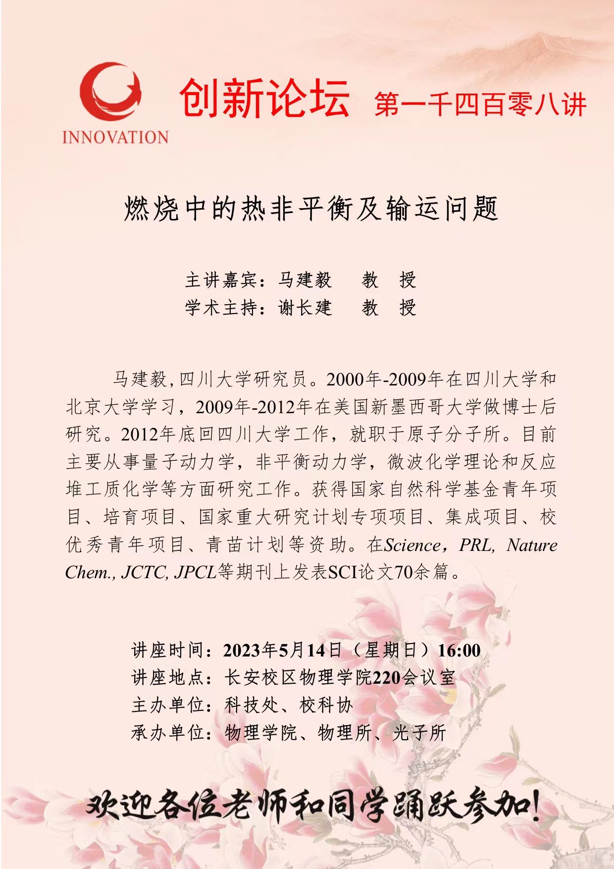 马建毅 教 授 welcome欢迎光临威尼斯集团创新论坛第一千四百零八讲:燃烧中的热非平衡及输运问题 讲座时间 2023年5月14日(星期日)16:00 讲座地点 长安校区物理学院220会议室 讲座人介绍 马建毅 教 授 讲座内容