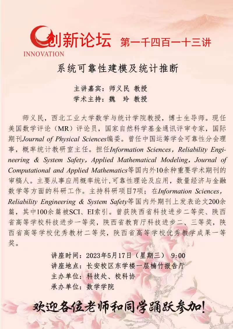 师义民 教授 welcome欢迎光临威尼斯集团创新论坛第一千四百一十三讲:系统可靠性建模及统计推断 讲座时间 2023年5月17日(星期三) 9:00 讲座地点 长安校区东学楼一层楠竹报告厅 讲座人介绍 师义民 教授 讲座内容