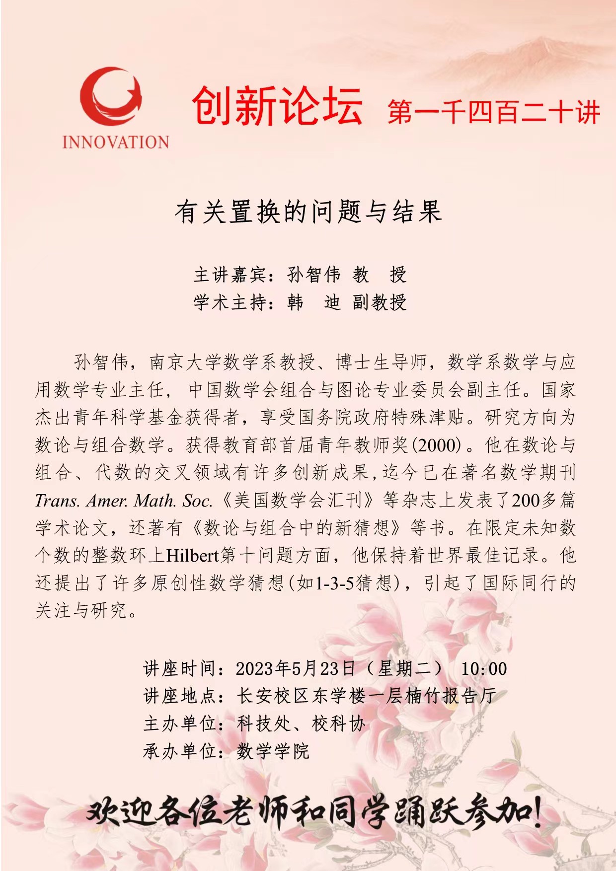 孙智伟 教 授 welcome欢迎光临威尼斯集团创新论坛第一千四百二十讲:有关置换的问题与结果 讲座时间 2023年5月23日(星期二) 10:00 讲座地点 长安校区东学楼一层楠竹报告厅 讲座人介绍 孙智伟 教 授 讲座内容