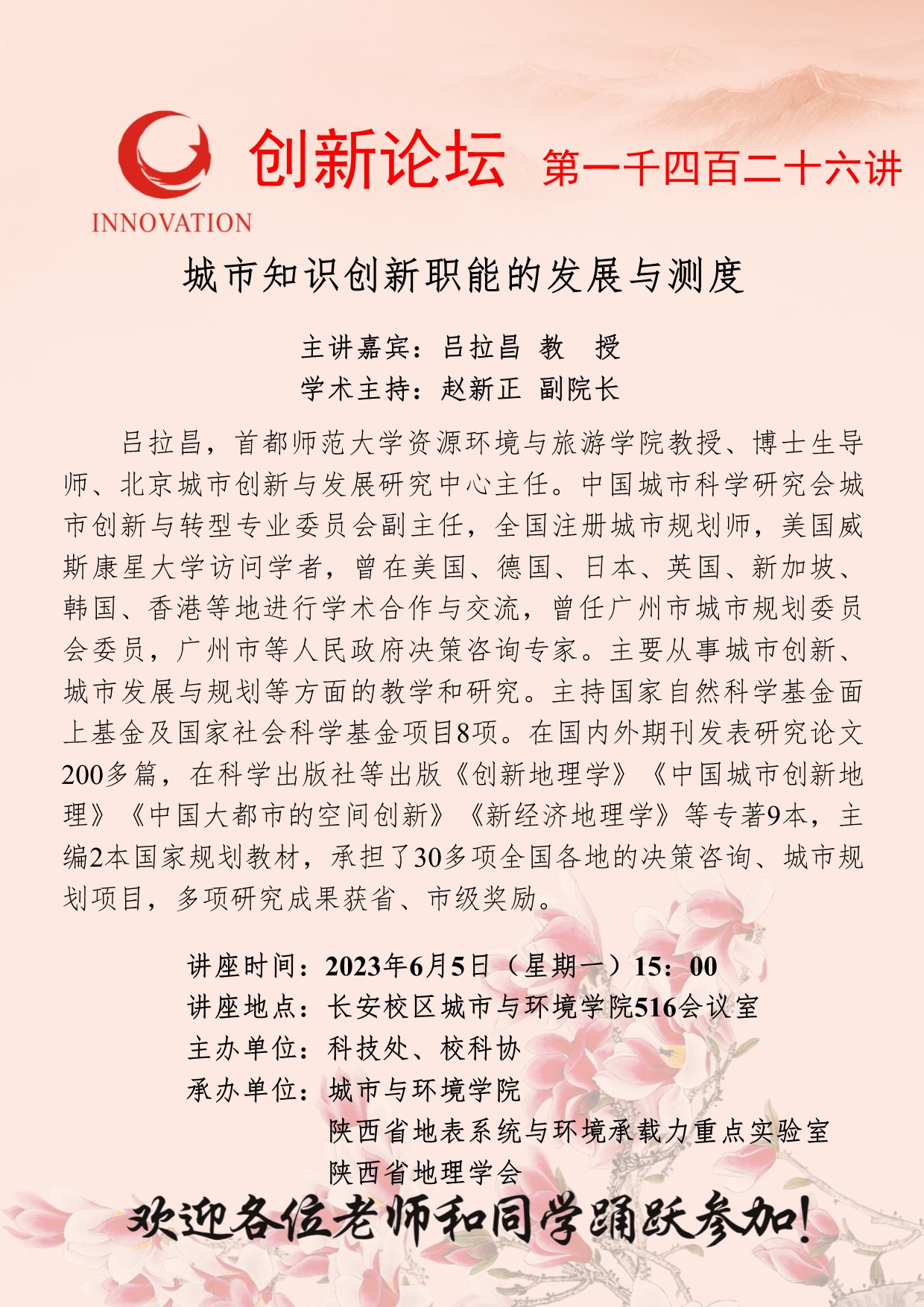 吕拉昌 教授 welcome欢迎光临威尼斯集团创新论坛第一千四百二十六讲:城市知识创新职能的发展与测度 讲座时间 2023年6月5日(星期一)15:00 讲座地点 长安校区城市与环境学院516会议室 讲座人介绍 吕拉昌 教授 讲座内容