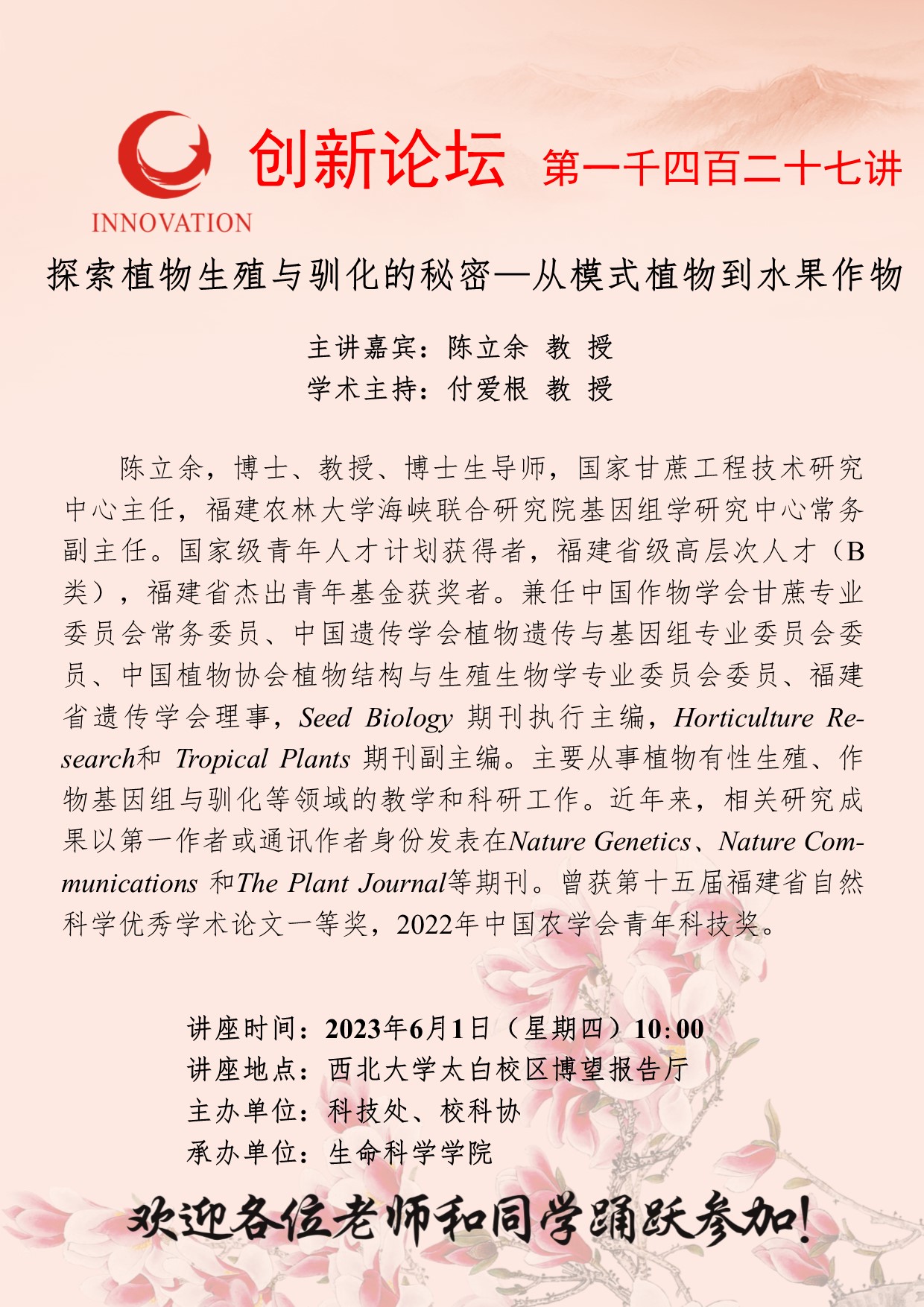 陈立余 教授 welcome欢迎光临威尼斯集团创新论坛第一千四百二十七讲:探索植物生殖与驯化的秘密—从模式植物到水果作物 讲座时间 2023年6月1日(星期四)10:00 讲座地点 welcome欢迎光临威尼斯集团太白校区博望报告厅 讲座人介绍 陈立余 教授 讲座内容