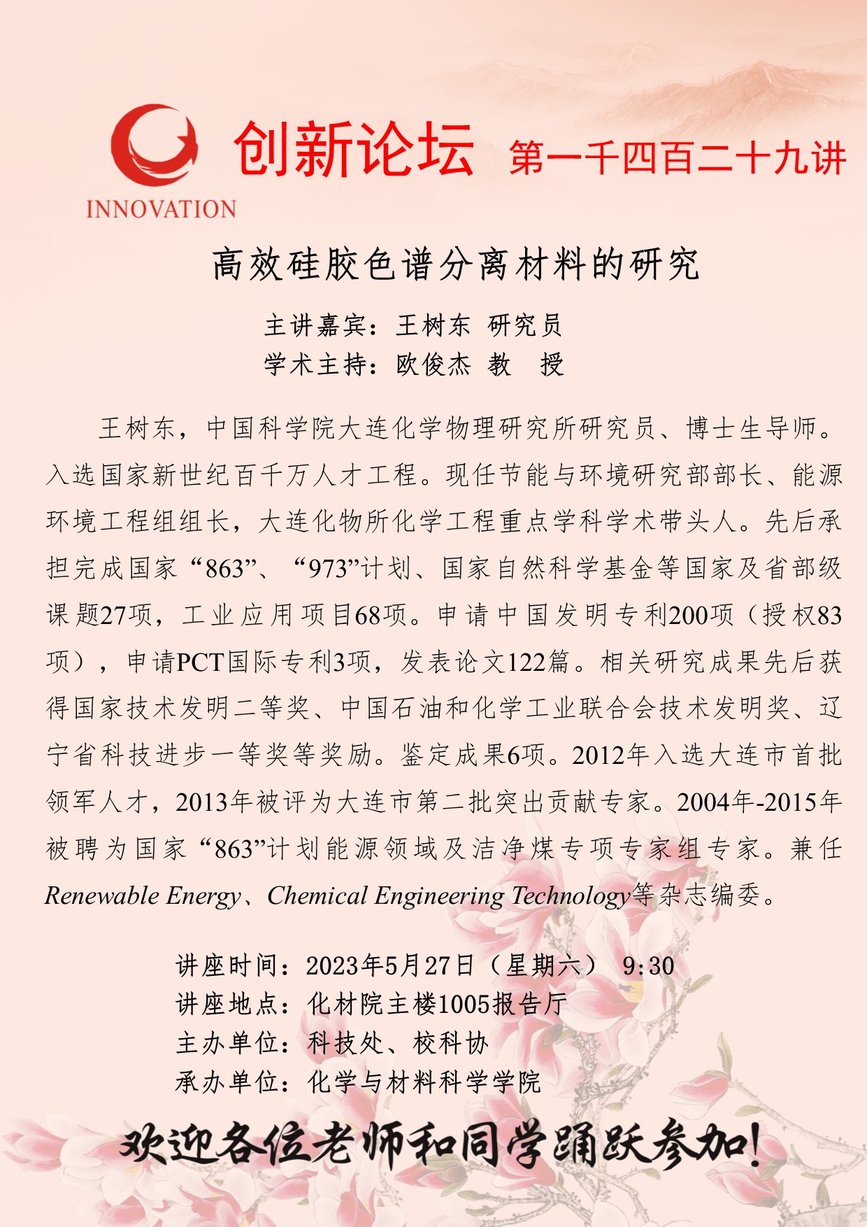 王树东 研究员 welcome欢迎光临威尼斯集团创新论坛第一千四百二十九讲:高效硅胶色谱分离材料的研究 讲座时间 2023年5月27日(星期六) 9:30 讲座地点 化材院主楼1005报告厅 讲座人介绍 王树东 研究员 讲座内容